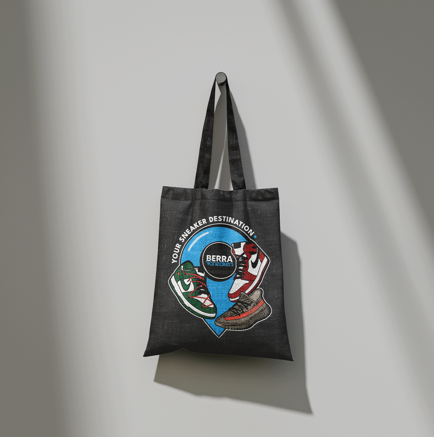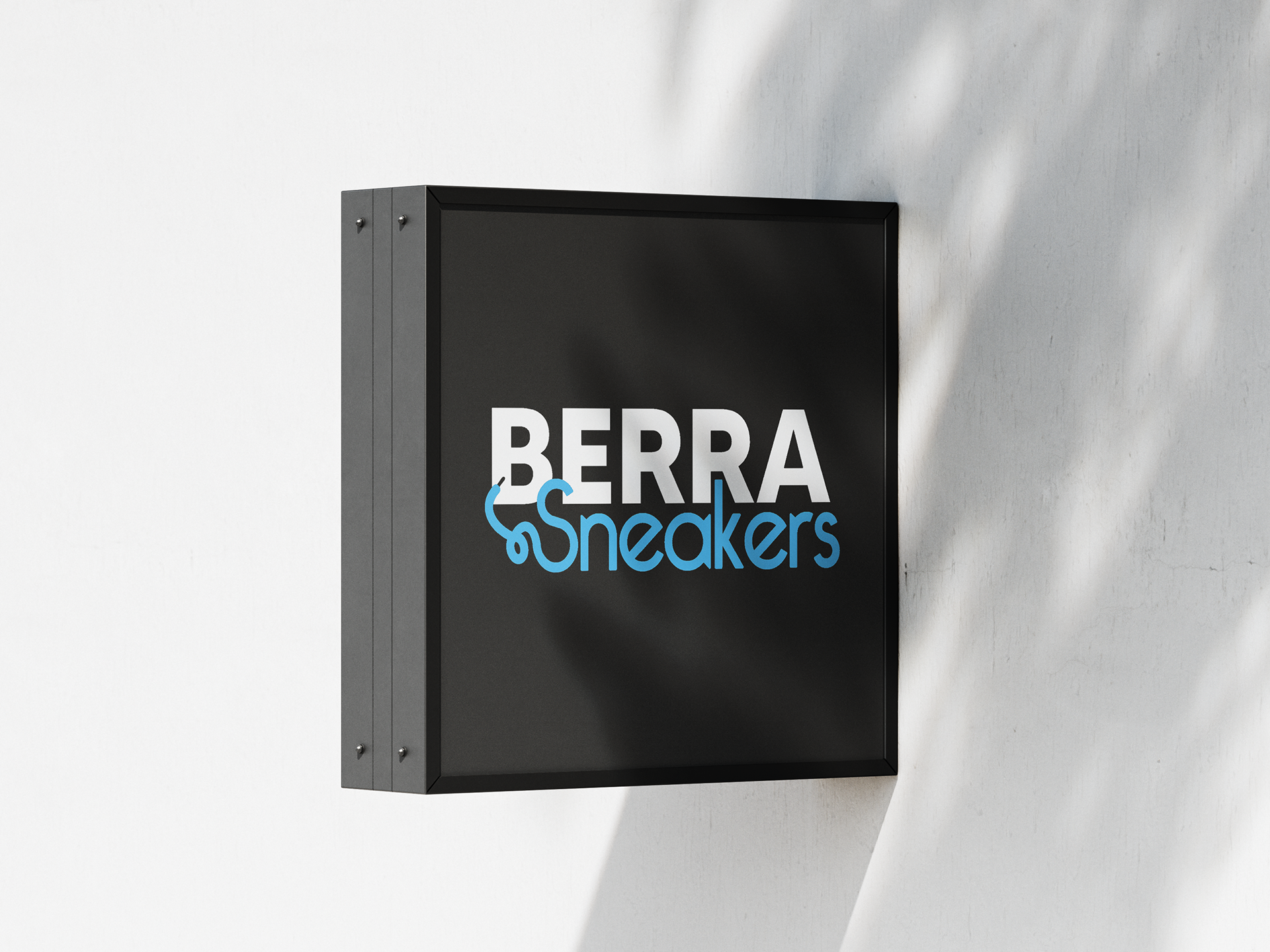 In 2023 ontwierp ik voor Berra Sneakers een nieuw logo, banner, visitekaartje en merchandise ontwerp voor hun sneakerwinkel. De opdracht was om een logo te ontwerpen met een zwarte achtergrond en blauwe letters, en een of meerdere letters te maken in de vorm van een veter. Op basis hiervan heb ik een strak logo ontworpen waarin de naam duidelijk leesbaar is, en waarbij de S van sneakers een veter moet voorstellen. Het uiteinde van deze letter is speels, en maakt het logo uniek. Het logo kan op deze manier ook gemakkelijk worden toegepast op een banner en visitekaartje.