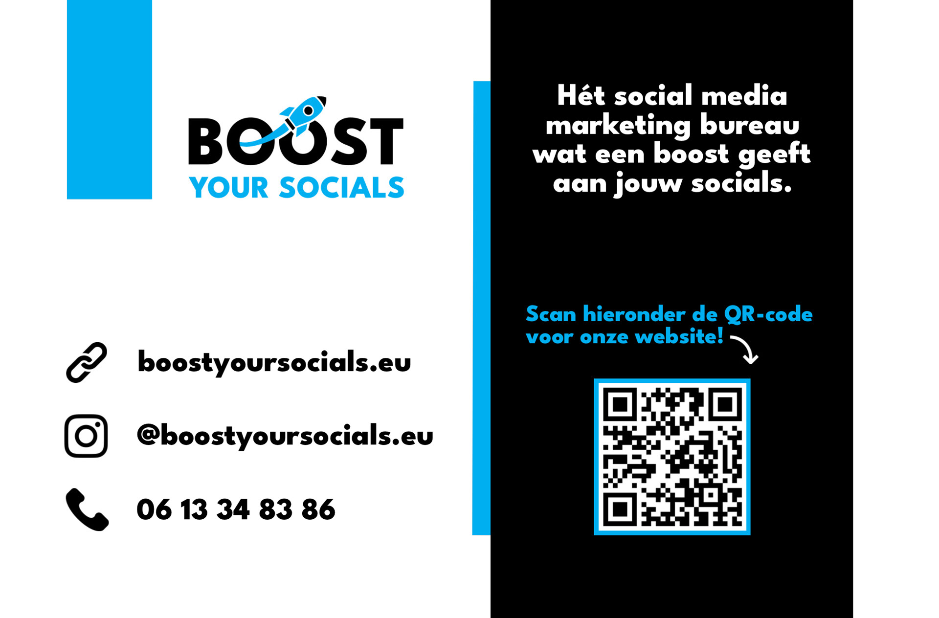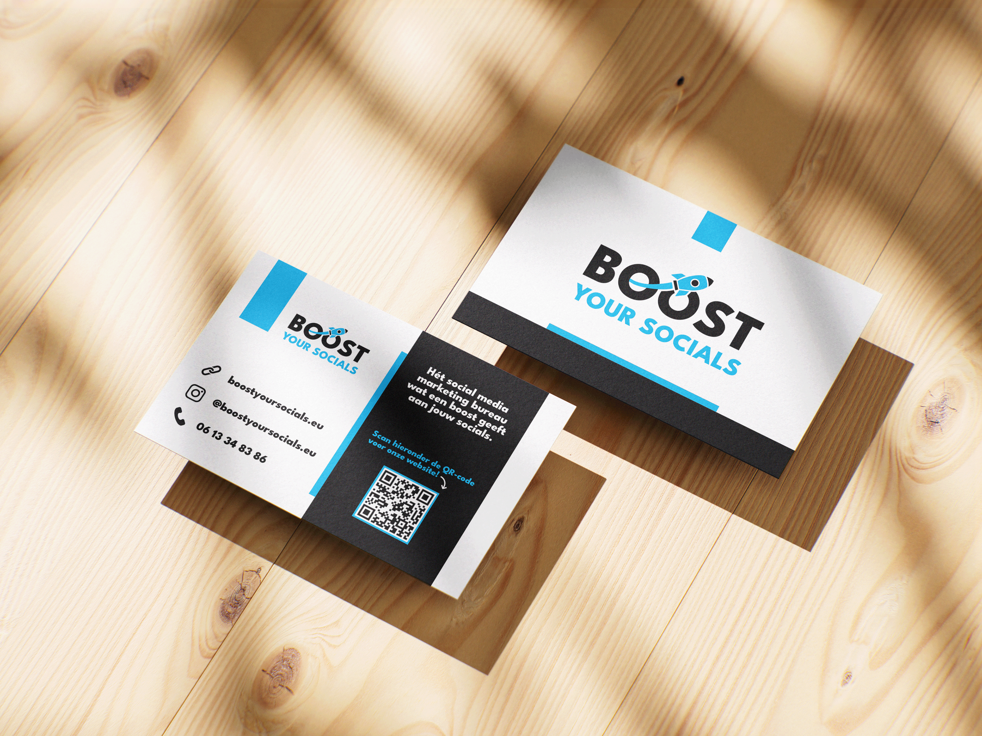 Op basis van het vernieuwde logo ontwierp ik ook de visitekaartjes. De voorkant gaf ik een eenvoudige maar strakke uitstraling, met het logo groot in beeld. Op de achterkant heb ik het logo opnieuw subtiel verwerkt en de strakke lijnen doorgezet, aangevuld met een slogan, contactgegevens en een QR-code naar de website van Boost Your Socials.