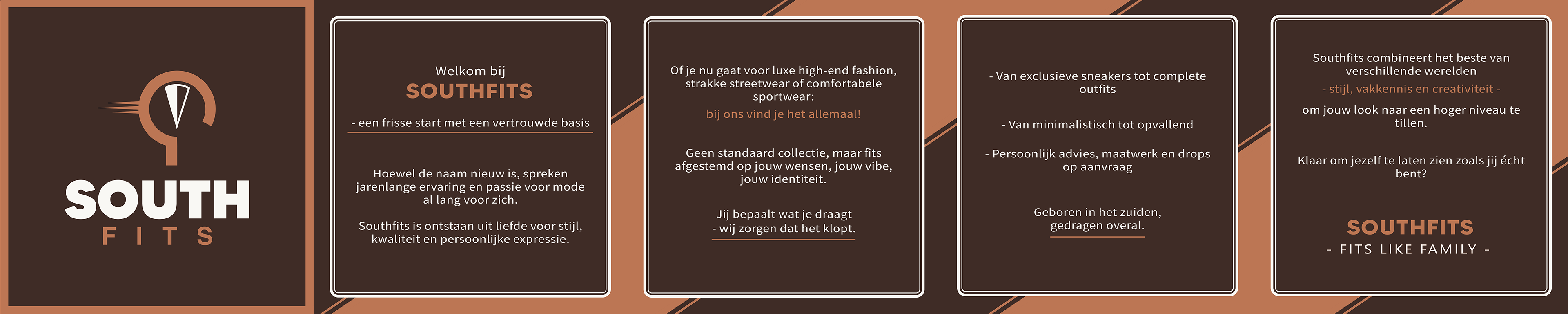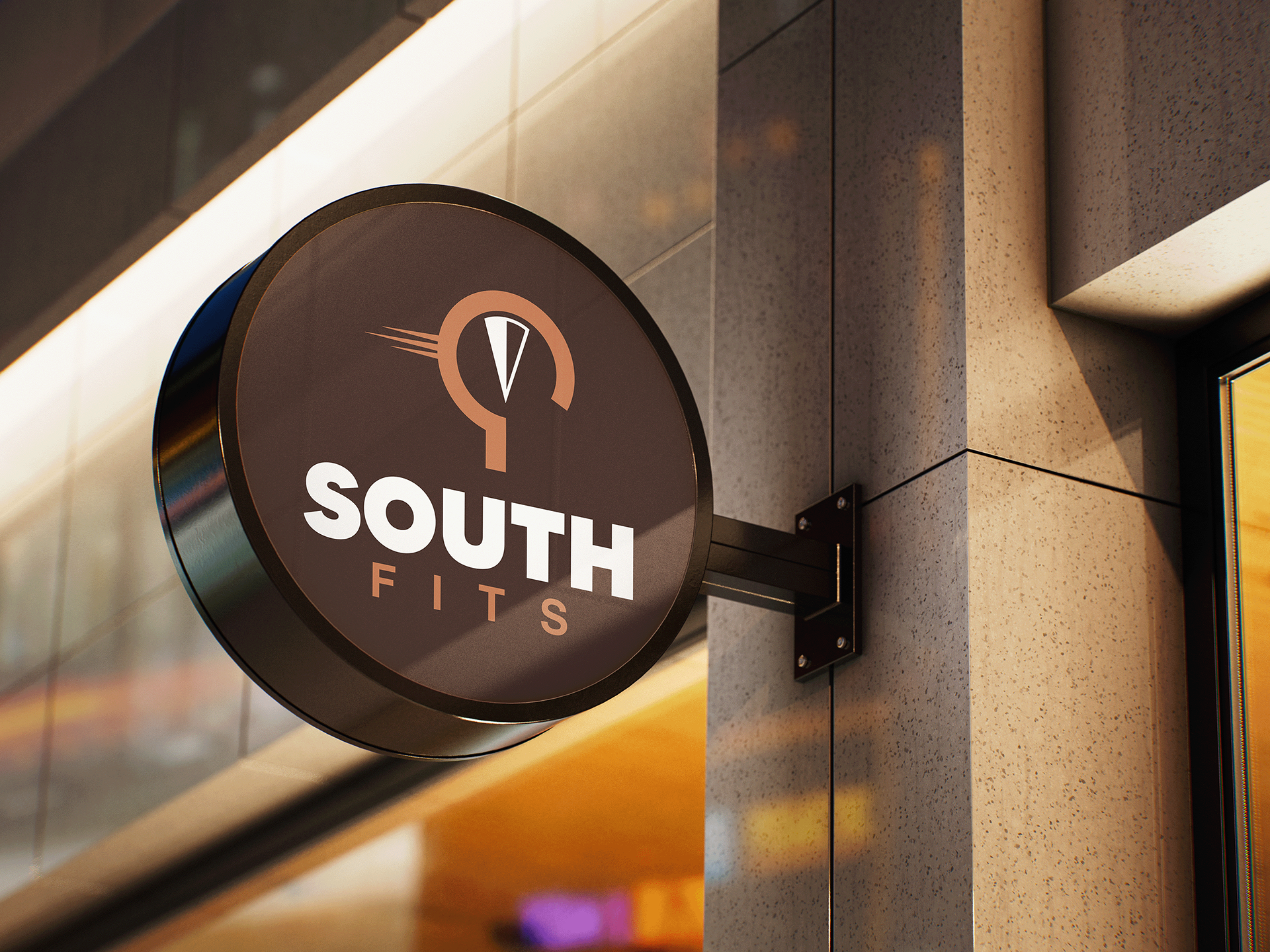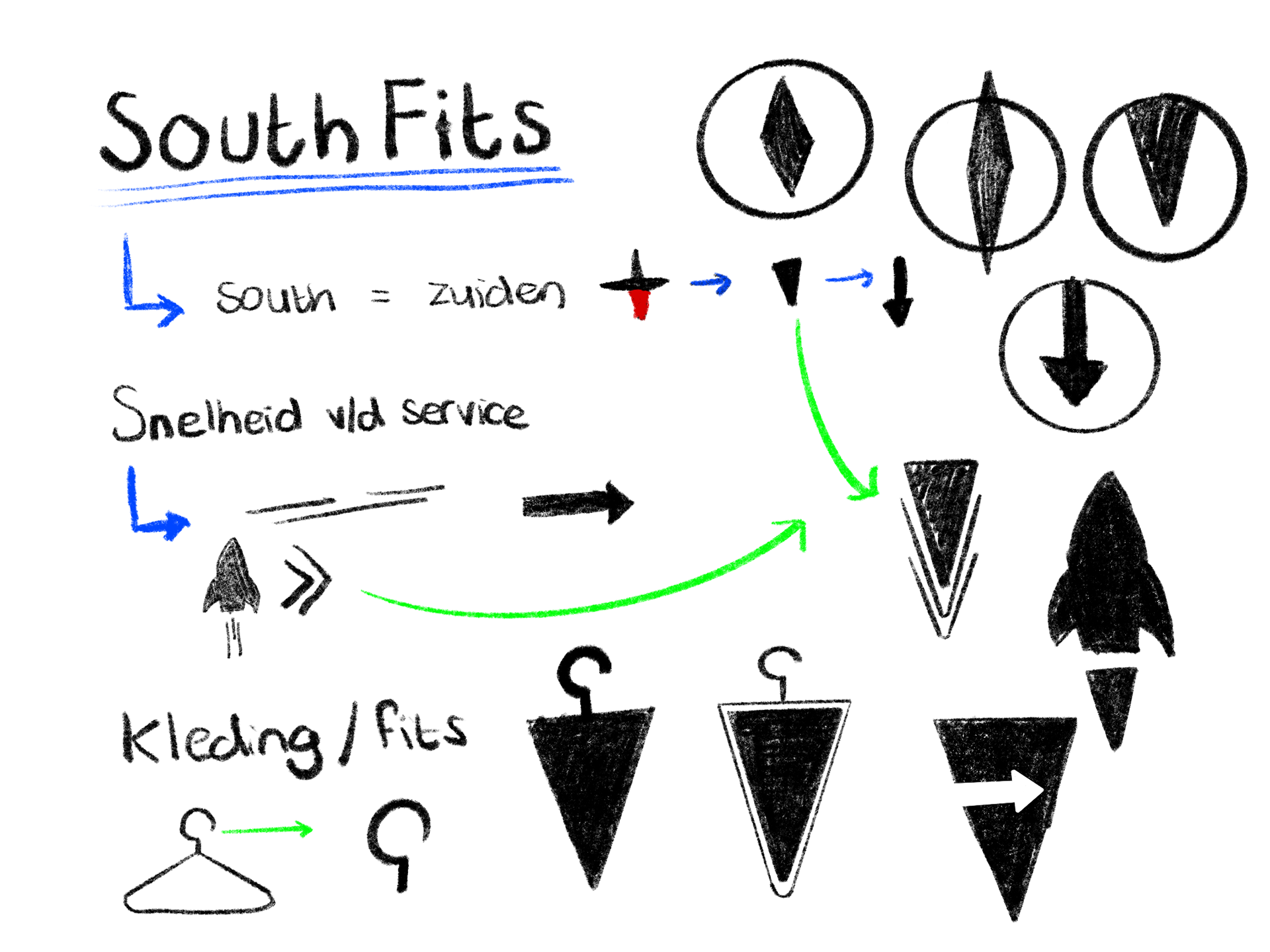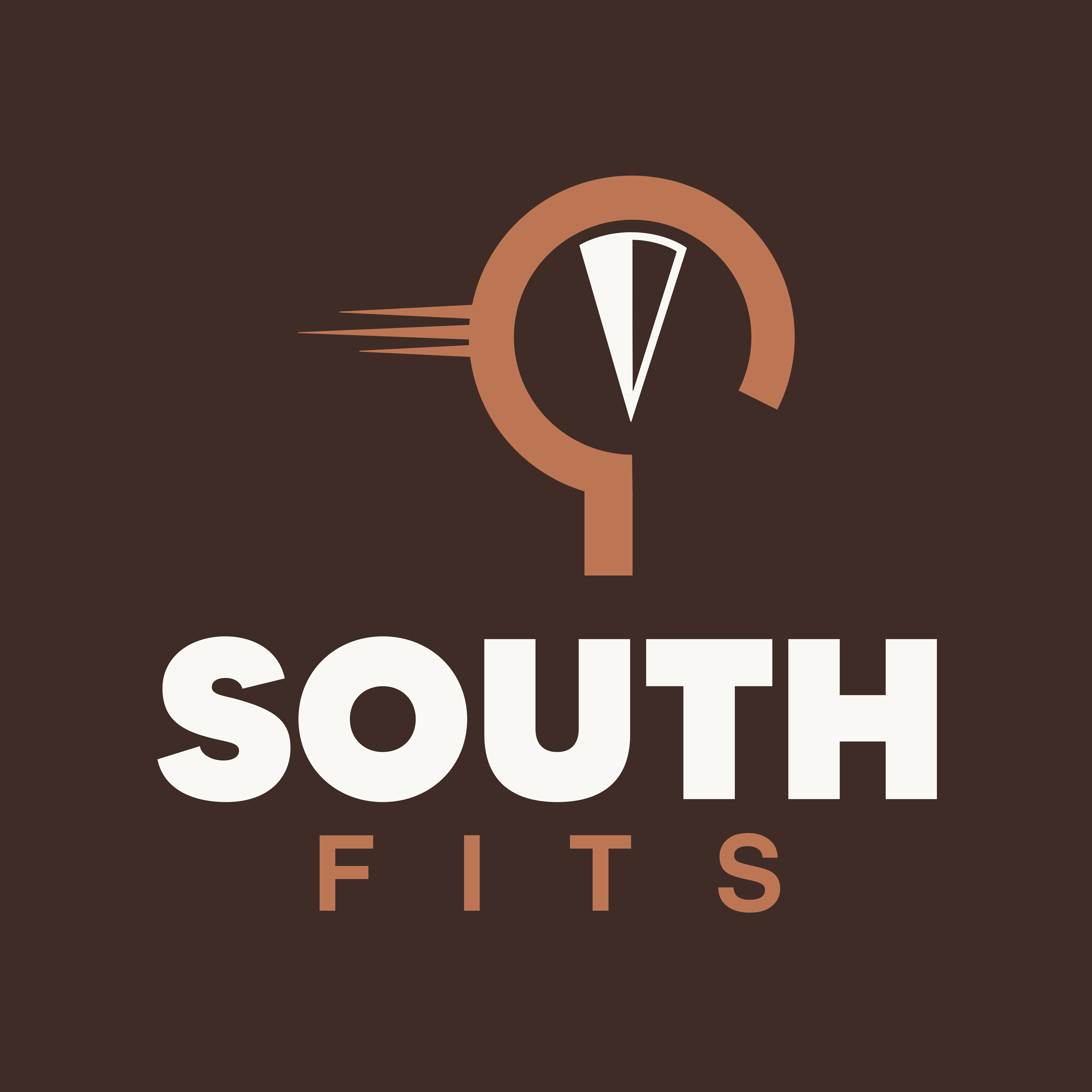 Het uiteindelijke ontwerp combineert een kompas in zuidelijke richting, die verwijst naar ‘South’, met een deel van een kledinghanger als verwijzing naar ‘Fits’. De strepen die aan de hanger zijn verbonden staan voor snelheid, passend bij de snelle service van het bedrijf. De simpele, strakke stijl benadrukt betaalbaarheid: geen overbodige luxe, maar goede basics. De vetgedrukte lijnen en het stevige lettertype versterken het gevoel van betrouwbaarheid.