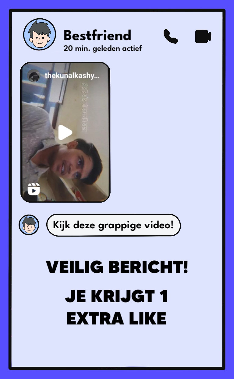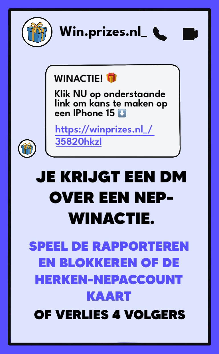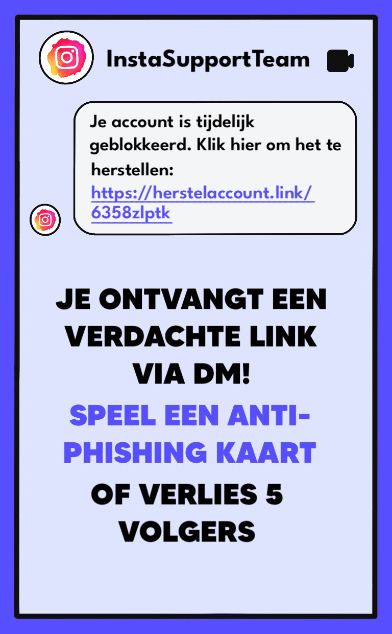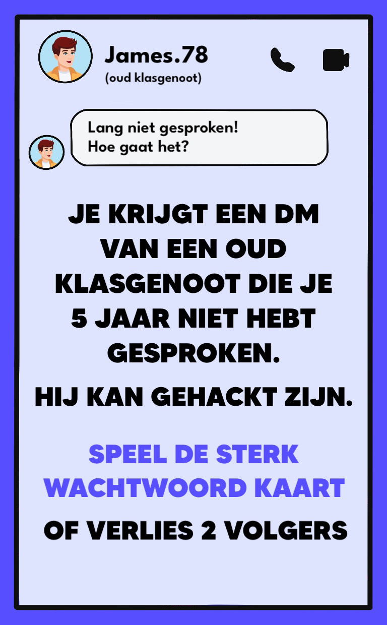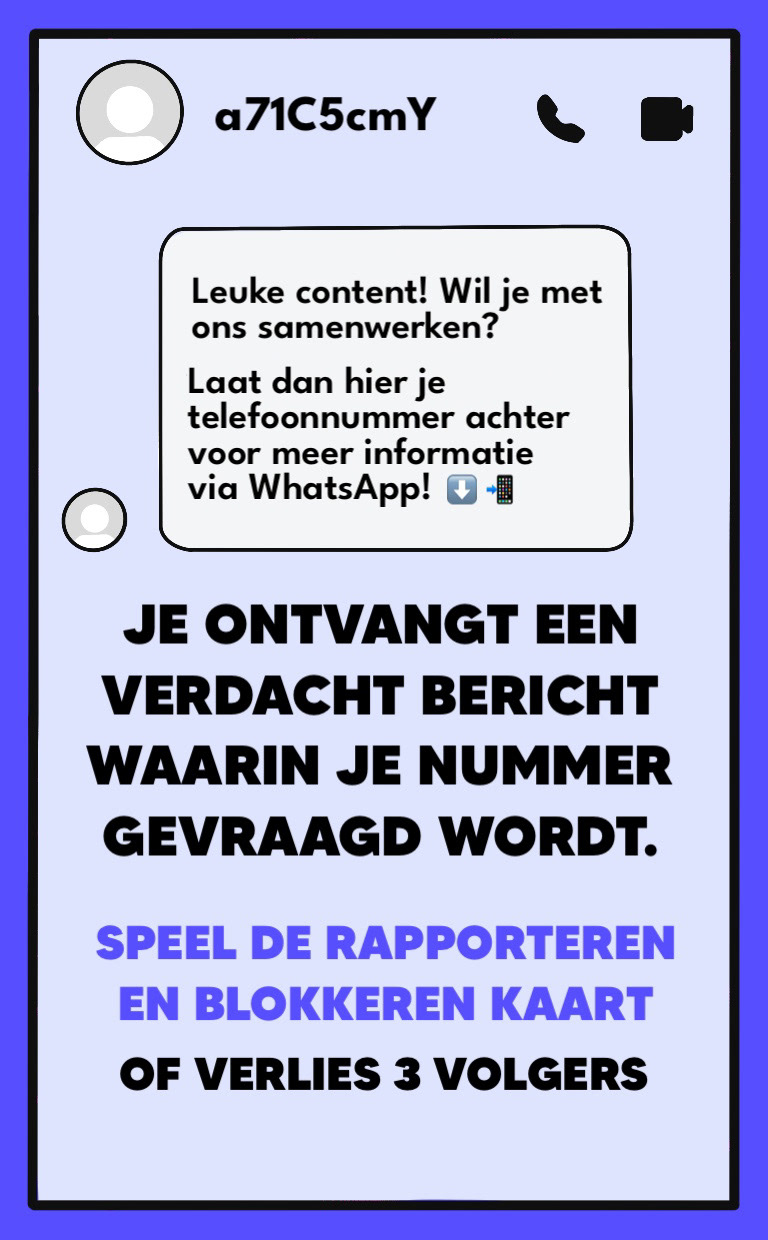 Dit zijn de DM-kaarten van het kaartspel. Deze geven realistische situaties weer van berichten die je kunt krijgen op Instagram. Er zijn veilige berichten, maar ook onveilige berichten met een hoger risico op cybercriminaliteit. Op de gevaarlijke berichten kunnen de spelers reageren met veiligheidskaarten om zich te weren tegen cybercriminaliteit, terwijl de veilige berichten likes of volgers op kunnen leveren.