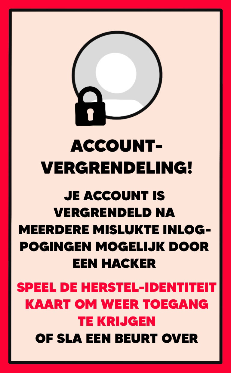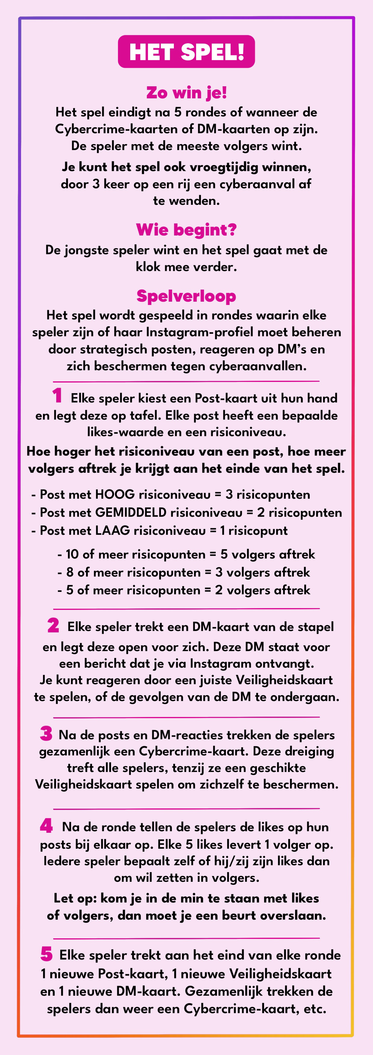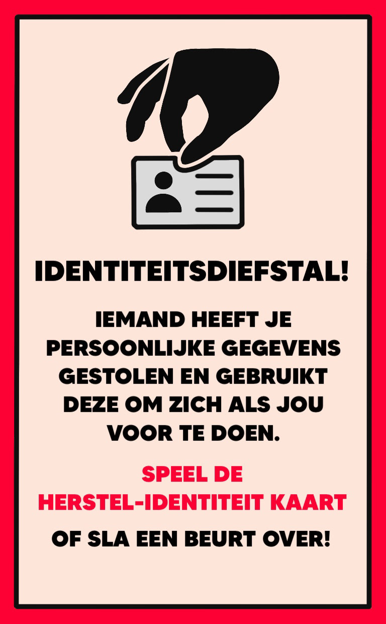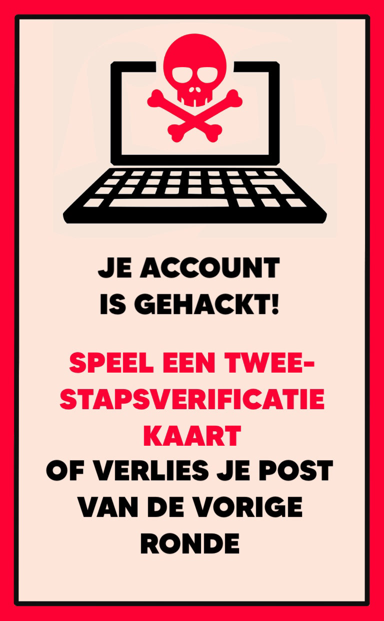 Dit zijn de Cybercrime kaarten van het kaartspel. Deze kaarten geven verschillende vormen van cybercriminaliteit weer die je kunt tegenkomen. Je kunt de Veiligheidskaarten hierboven gebruiken om je af te weren tegen de gevaren. Doe je dit niet, dan volgt er een consequentie zoals een beurt overslaan, likes inleveren of volgers verliezen.
