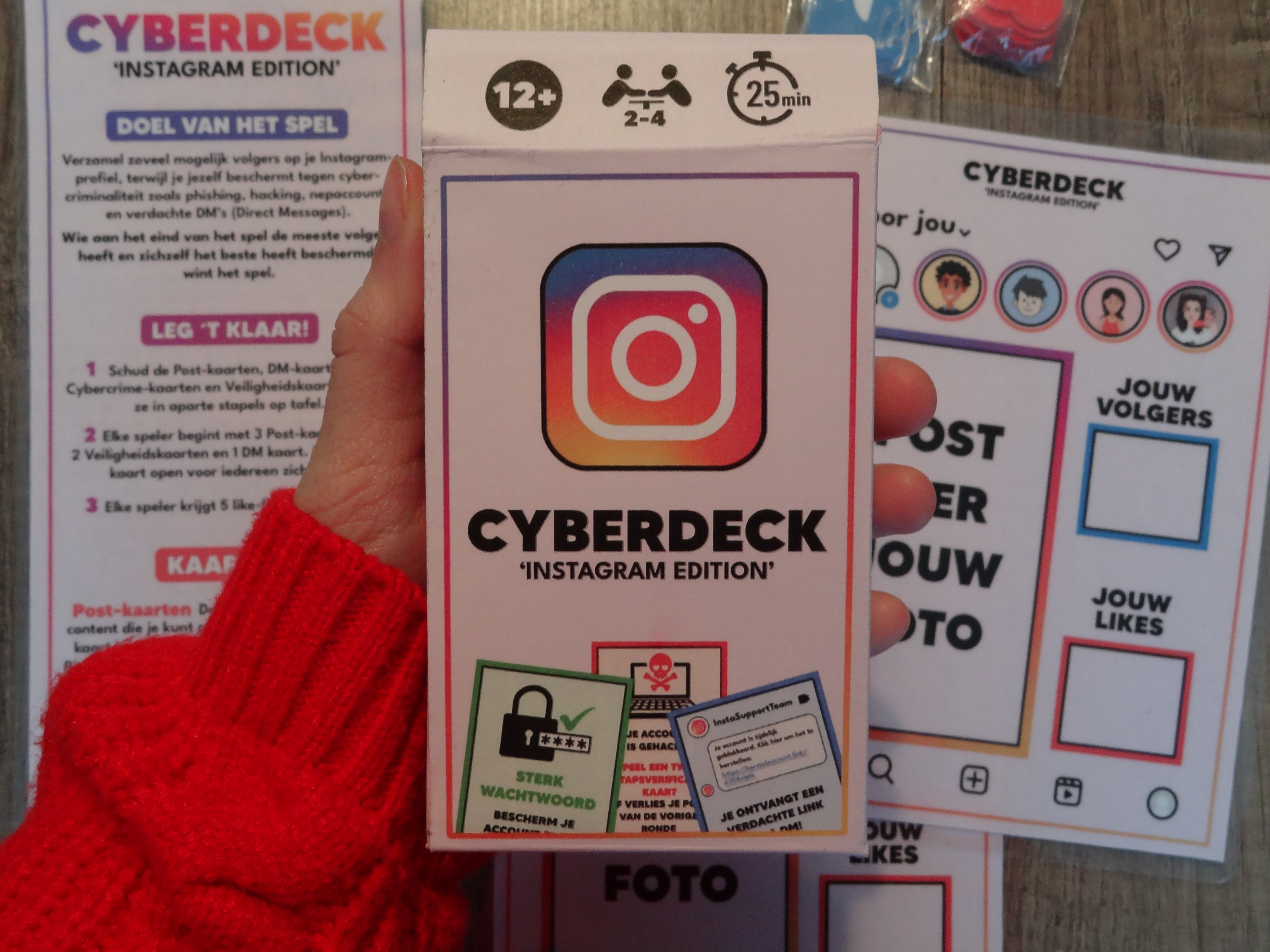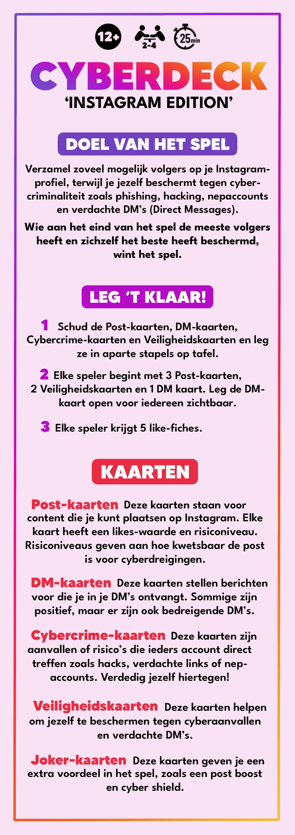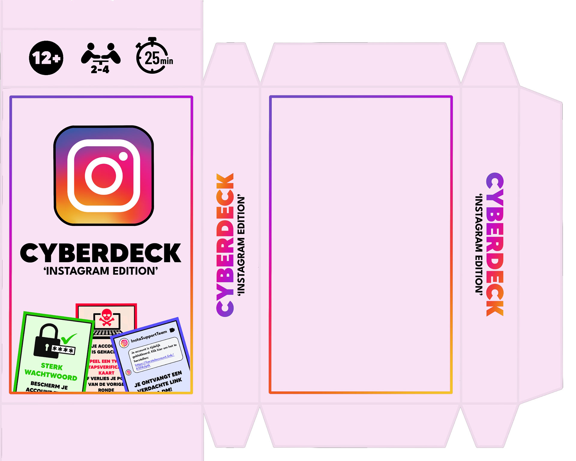 Om dit te kunnen bereiken, heb ik het kaartspel Cyberdeck: Instagram Edition bedacht. In dit kaartspel komen realistische situaties van cybercriminaliteit voor. Spelers kunnen Instagram-posts plaatsen met verschillende risiconiveaus, en acties uitvoeren om zich daartegen te beschermen. Met het spel wil ik jongeren bewuster maken van hun gedrag op Instagram, zodat ze beter doordachte keuzes kunnen maken. Daarnaast helpt het hen om meer controle te krijgen over hun persoonlijke informatie en zo minder risico te lopen op ongewenste interacties. De kaarten, spelhandleiding en het kaartdoosje heb ik zelf getekend en ontworpen met Procreate. Hieronder laat ik alle ontworpen kaarten voor het spel zien, en leg ik uit hoe het werkt: