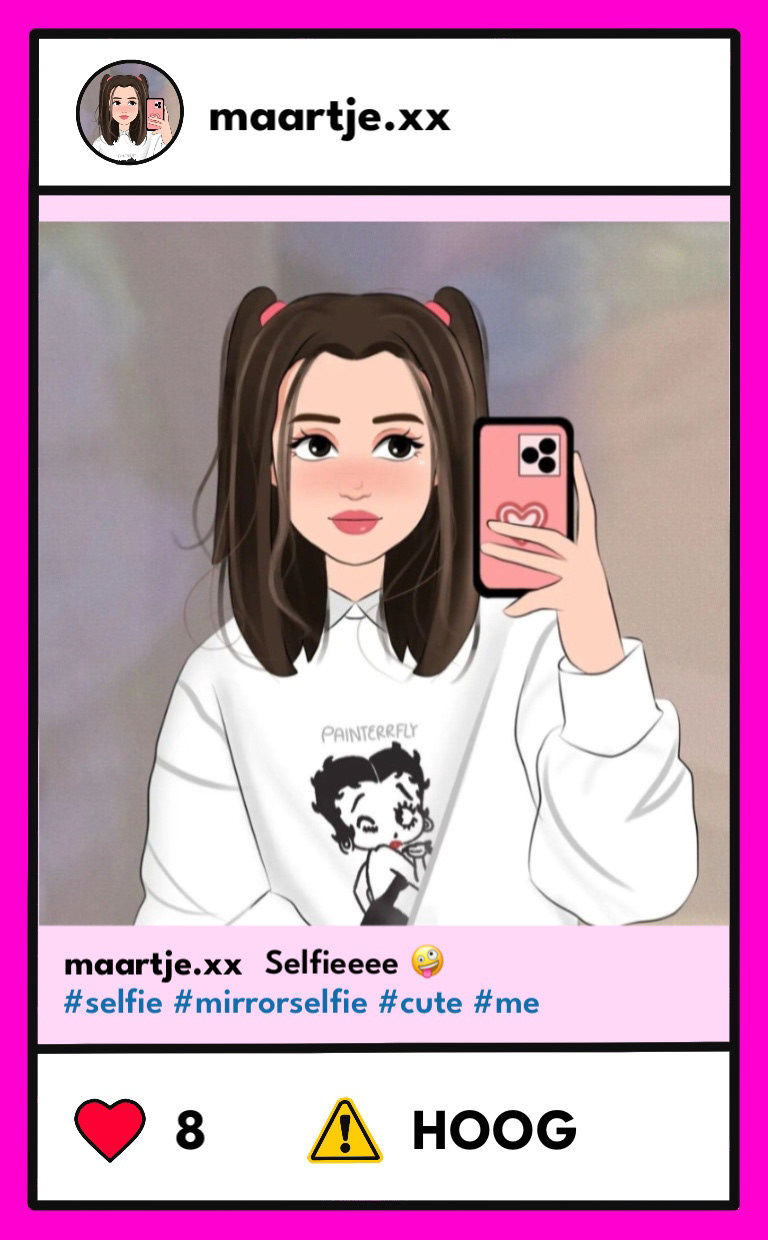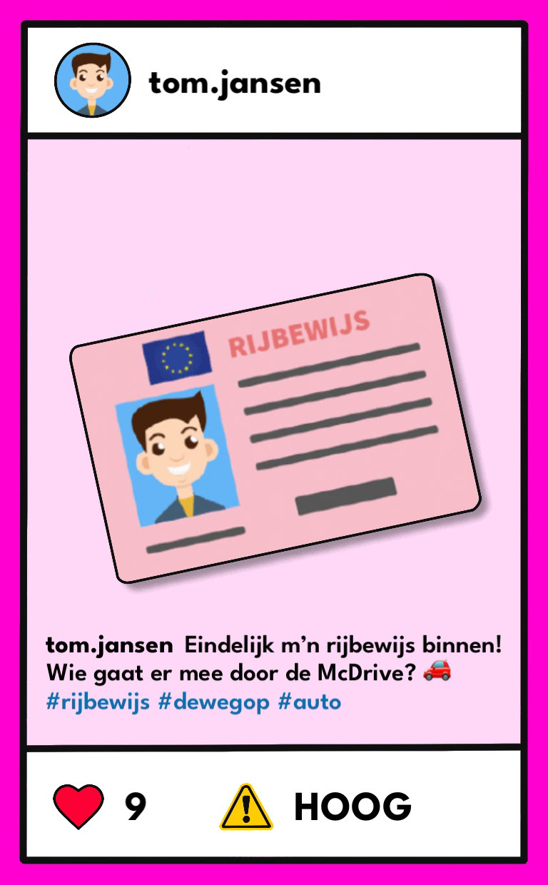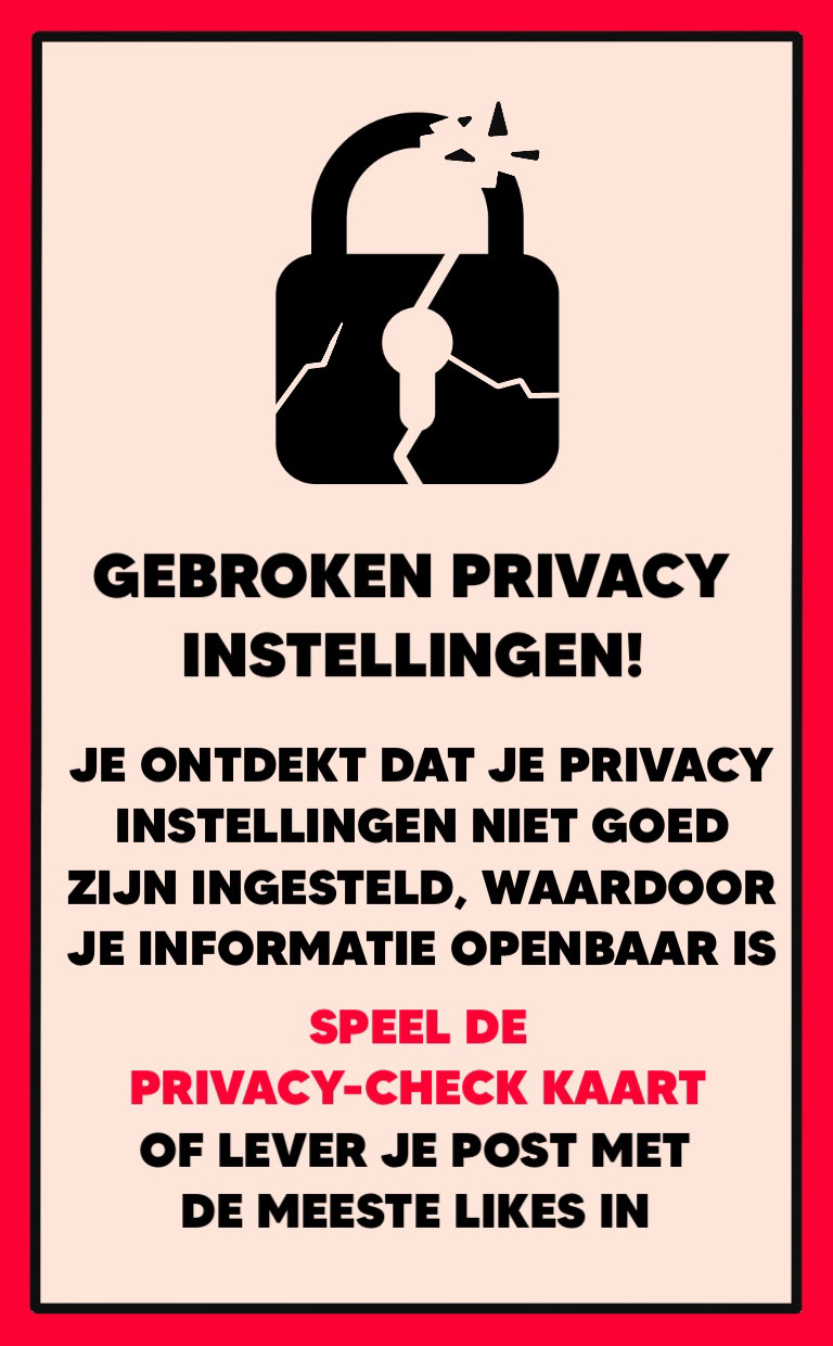 Dit zijn de post-kaarten van het kaartspel. Deze stellen Instagram posts voor die spelers kunnen plaatsen, ieder met een eigen risiconiveau. Er zijn posts met een hoog, gemiddeld of laag risico op cybercriminaliteit. Met de posts kun je ook een bepaald aantal likes verdienen.