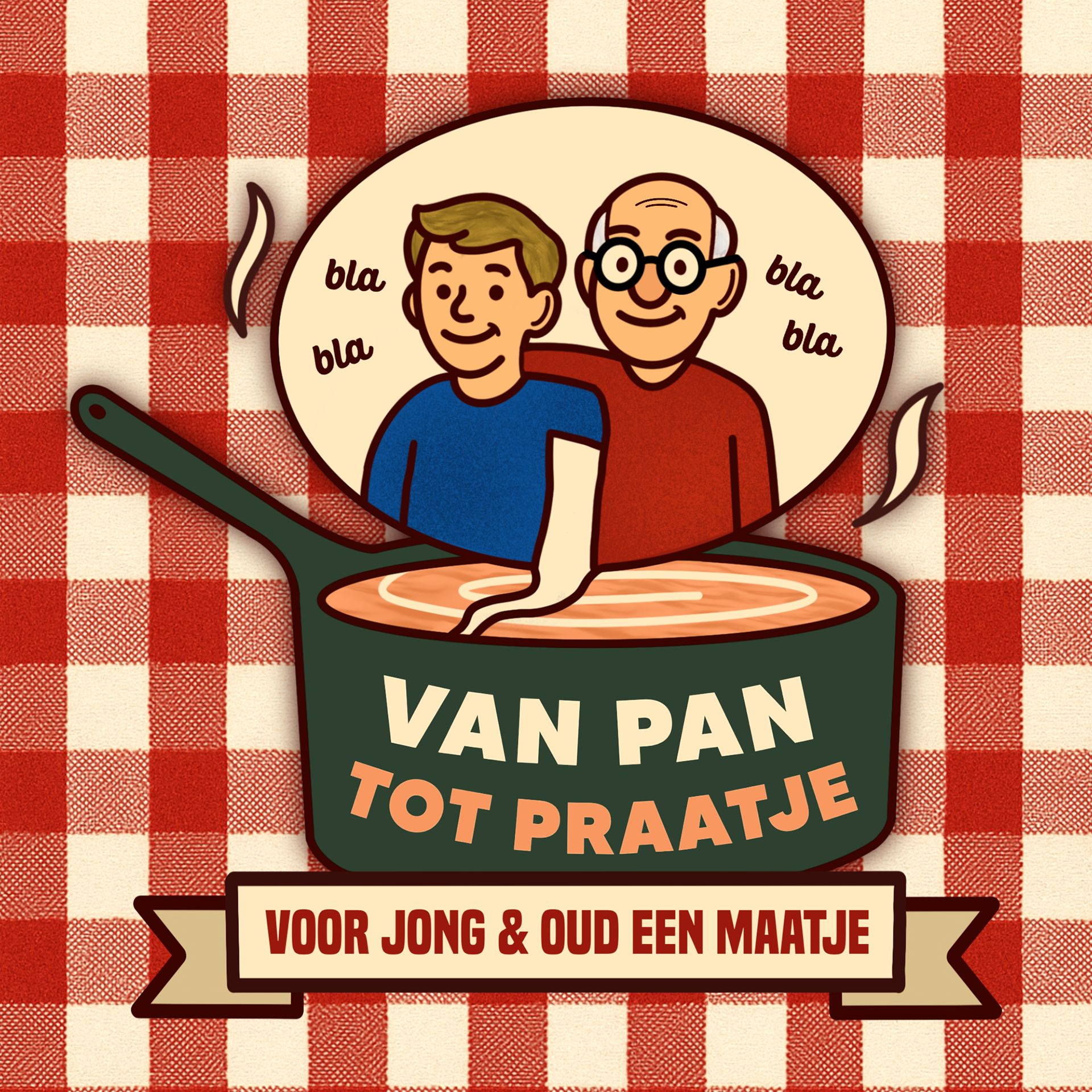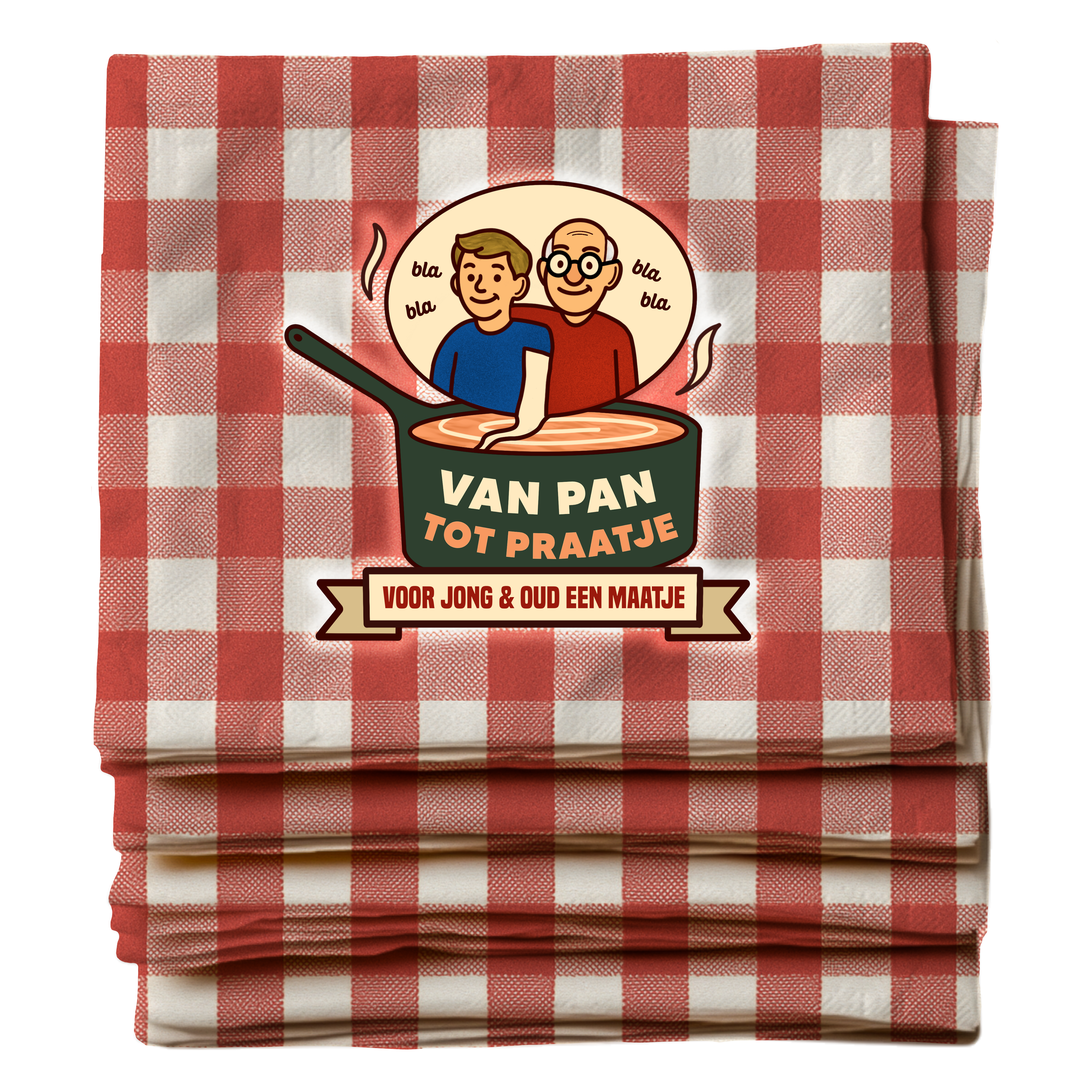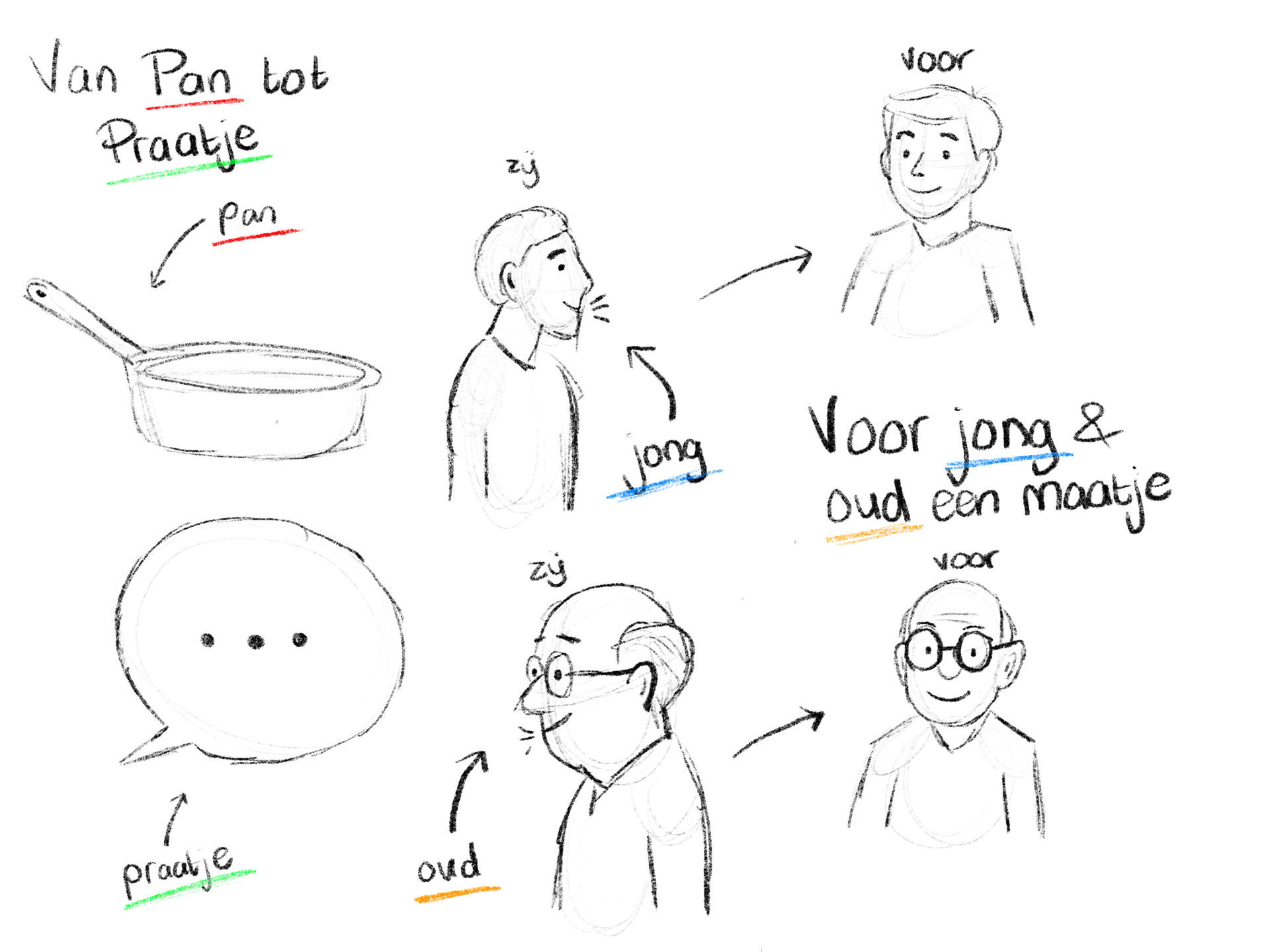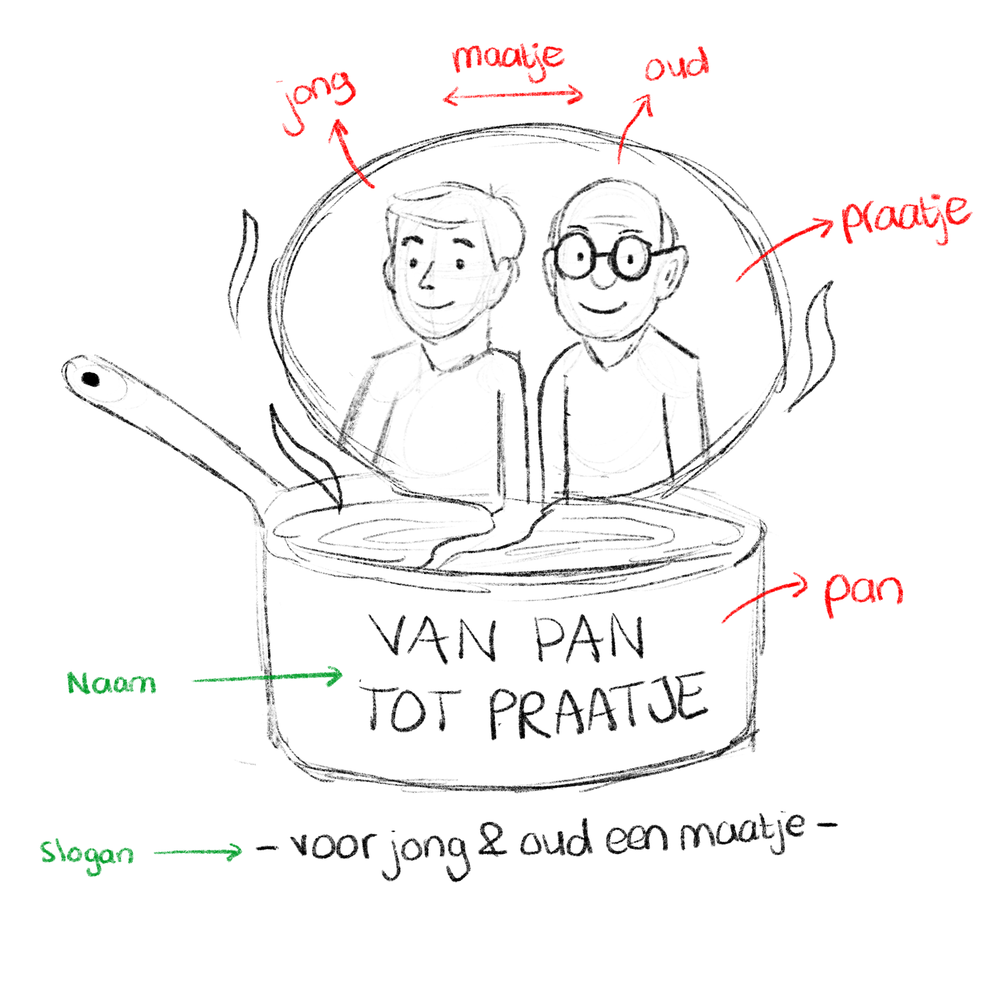 Allereerst heb ik het logo voor het project ontworpen. In het logo staat een pan centraal, waaruit een spraakwolkje komt met daarin een jongere en een oudere. Dit beeld laat zien dat uit de pan, ofwel het samen koken, een gesprek tussen generaties kan ontstaan. Zo wordt 'Van Pan Tot Praatje' beeldend gemaakt. Daarnaast heb ik de slogan ‘Voor jong en oud een maatje’ bedacht, die aansluit bij het doel van ons concept: het creëren van verbinding tussen jongeren en ouderen.