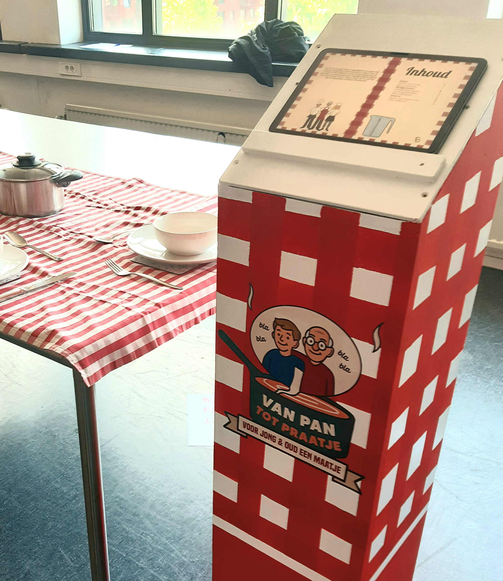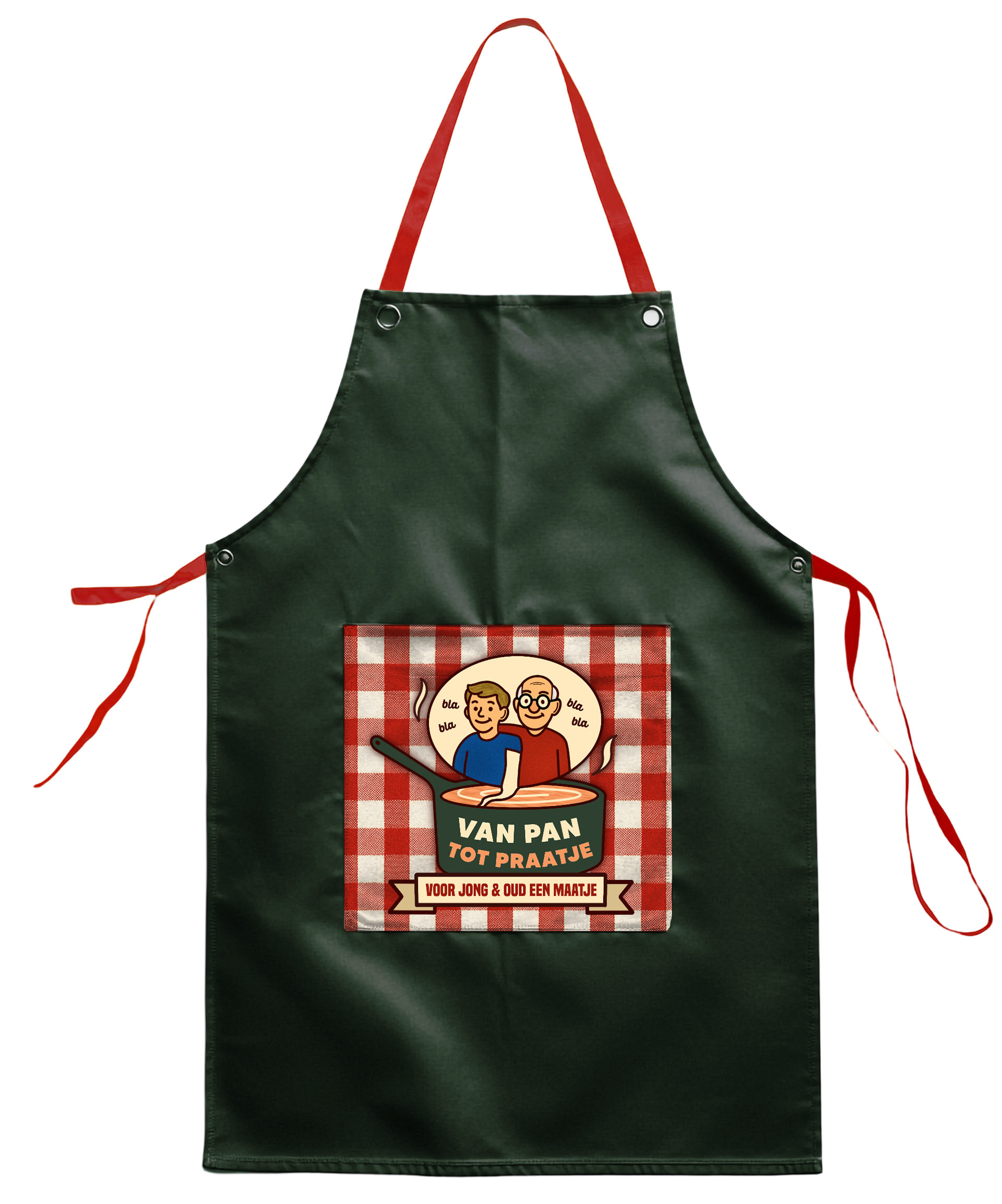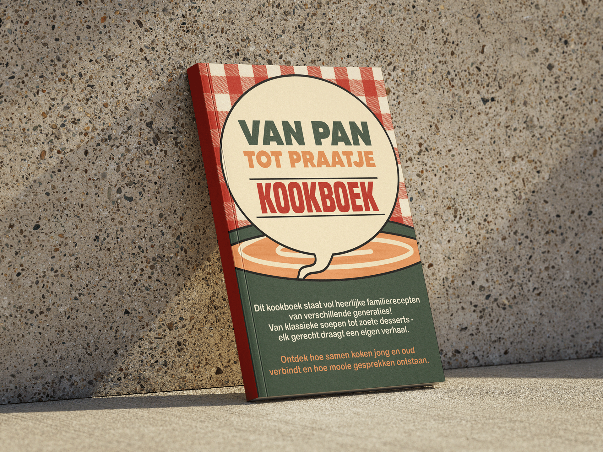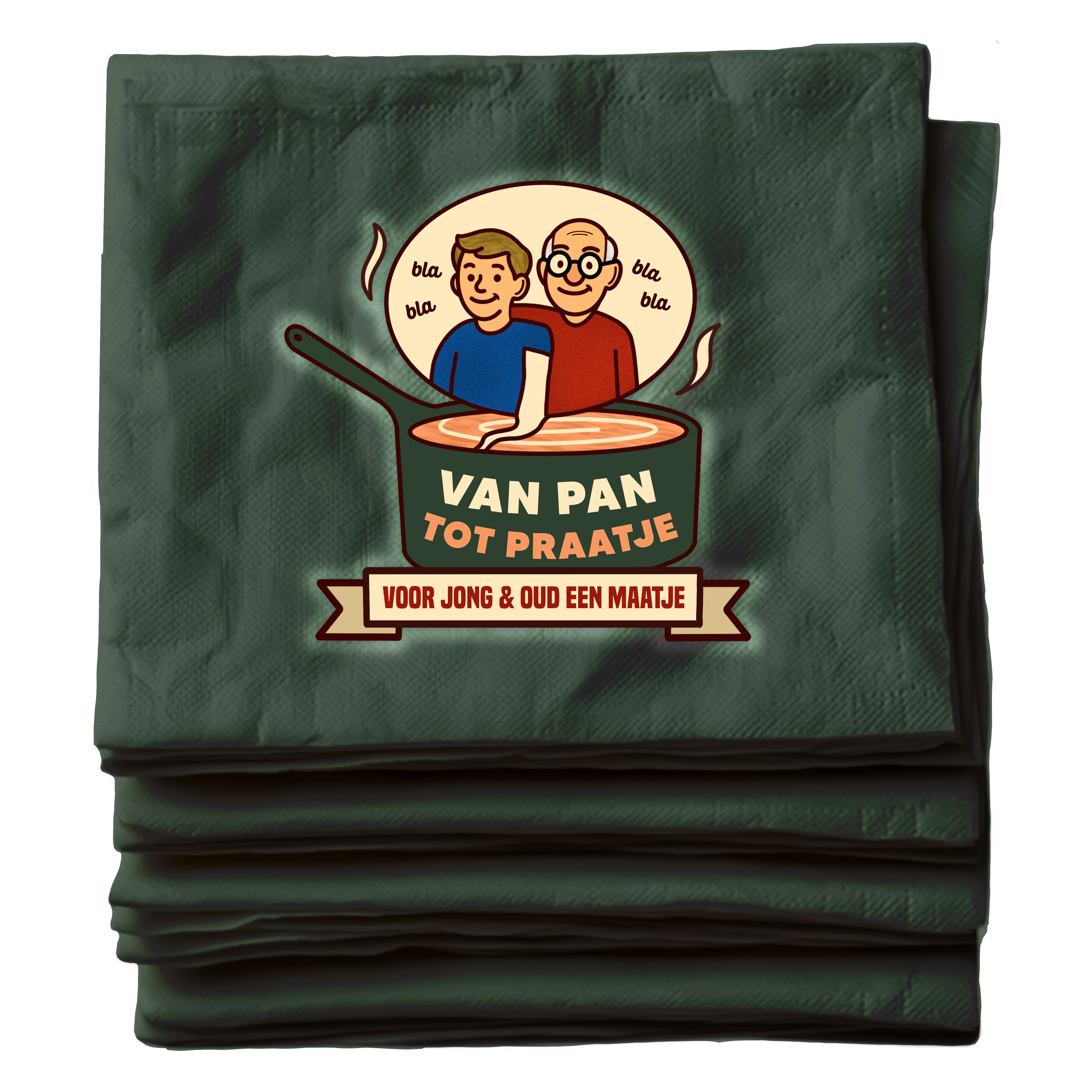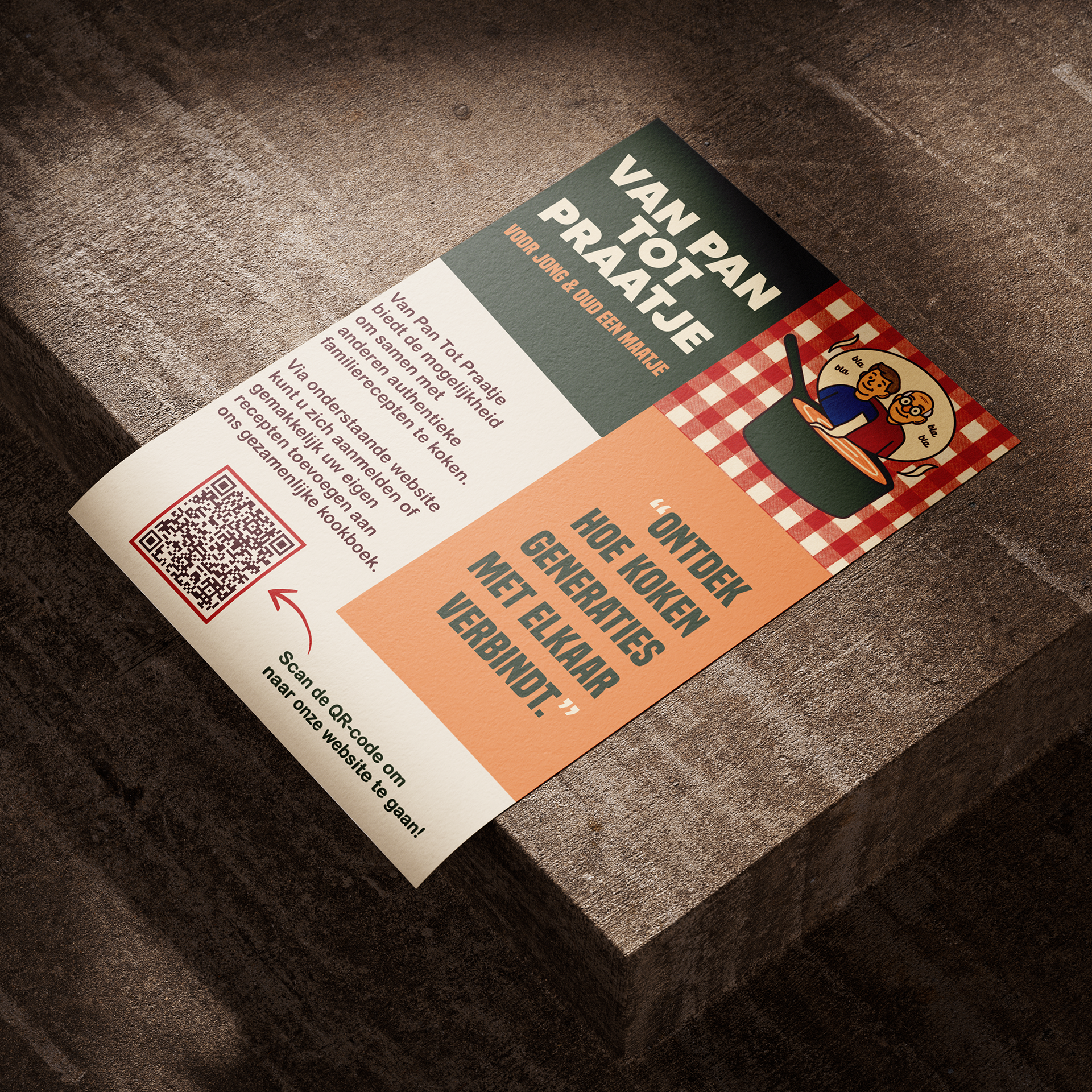 Allereerst heb ik het logo voor het project ontworpen. In het logo staat een pan centraal, waaruit een spraakwolkje komt met daarin een jongere en een oudere. Dit beeld laat zien dat uit de pan, ofwel het samen koken, een gesprek tussen generaties kan ontstaan. Zo wordt 'Van Pan Tot Praatje' beeldend gemaakt. Daarnaast heb ik de slogan ‘Voor jong en oud een maatje’ bedacht, die aansluit bij het doel van ons concept: het creëren van verbinding tussen jongeren en ouderen.