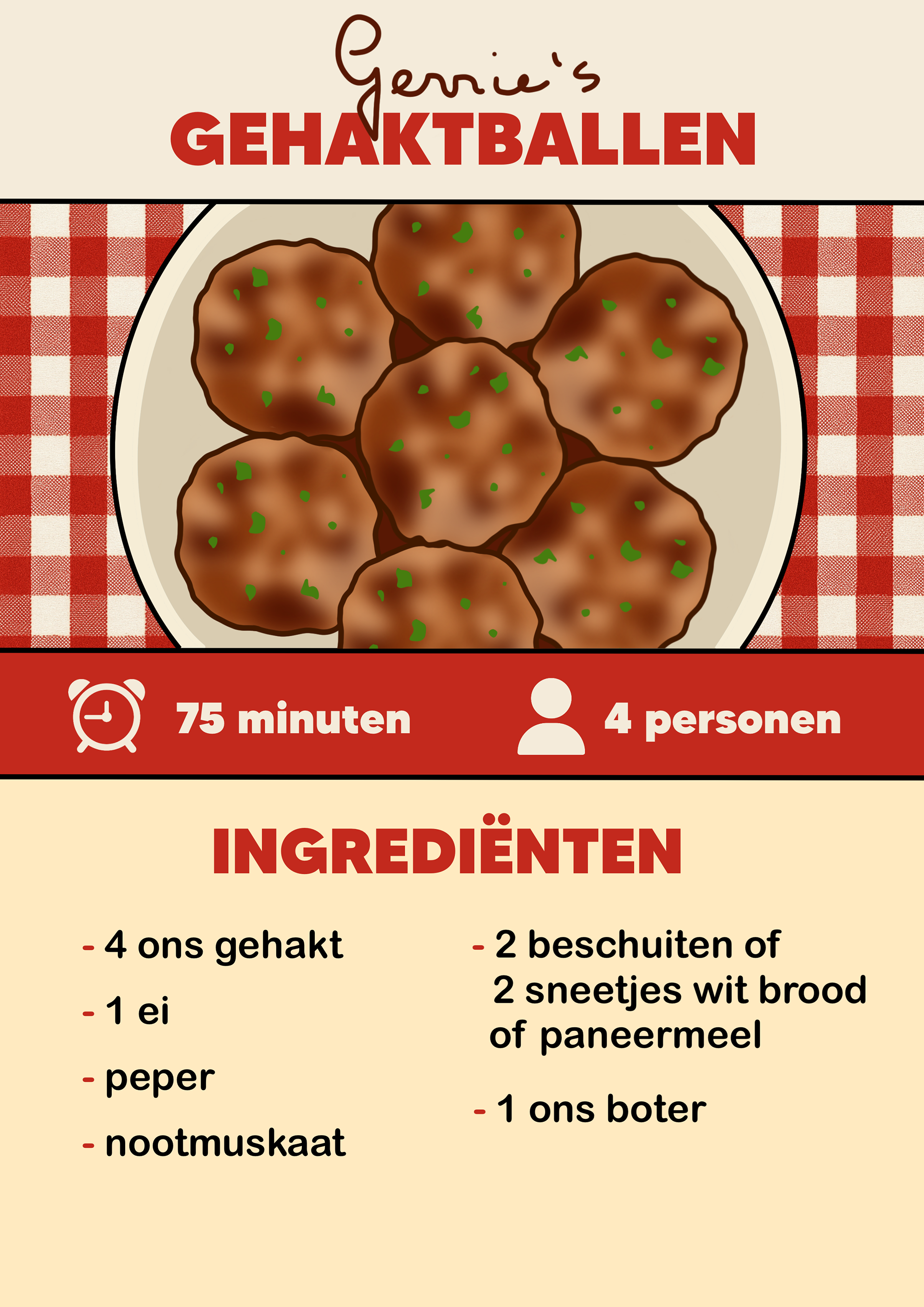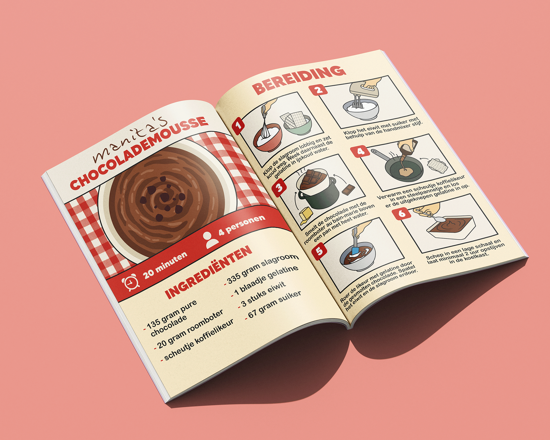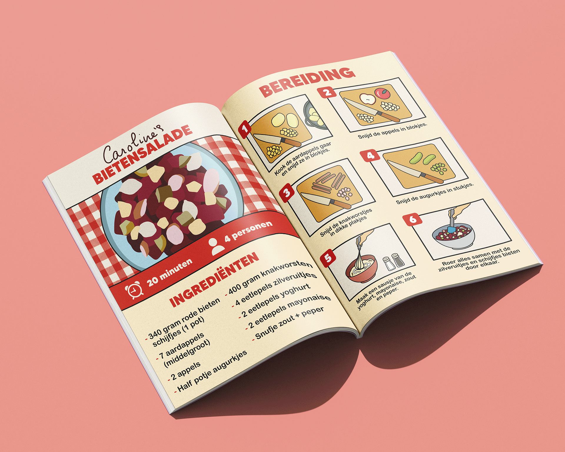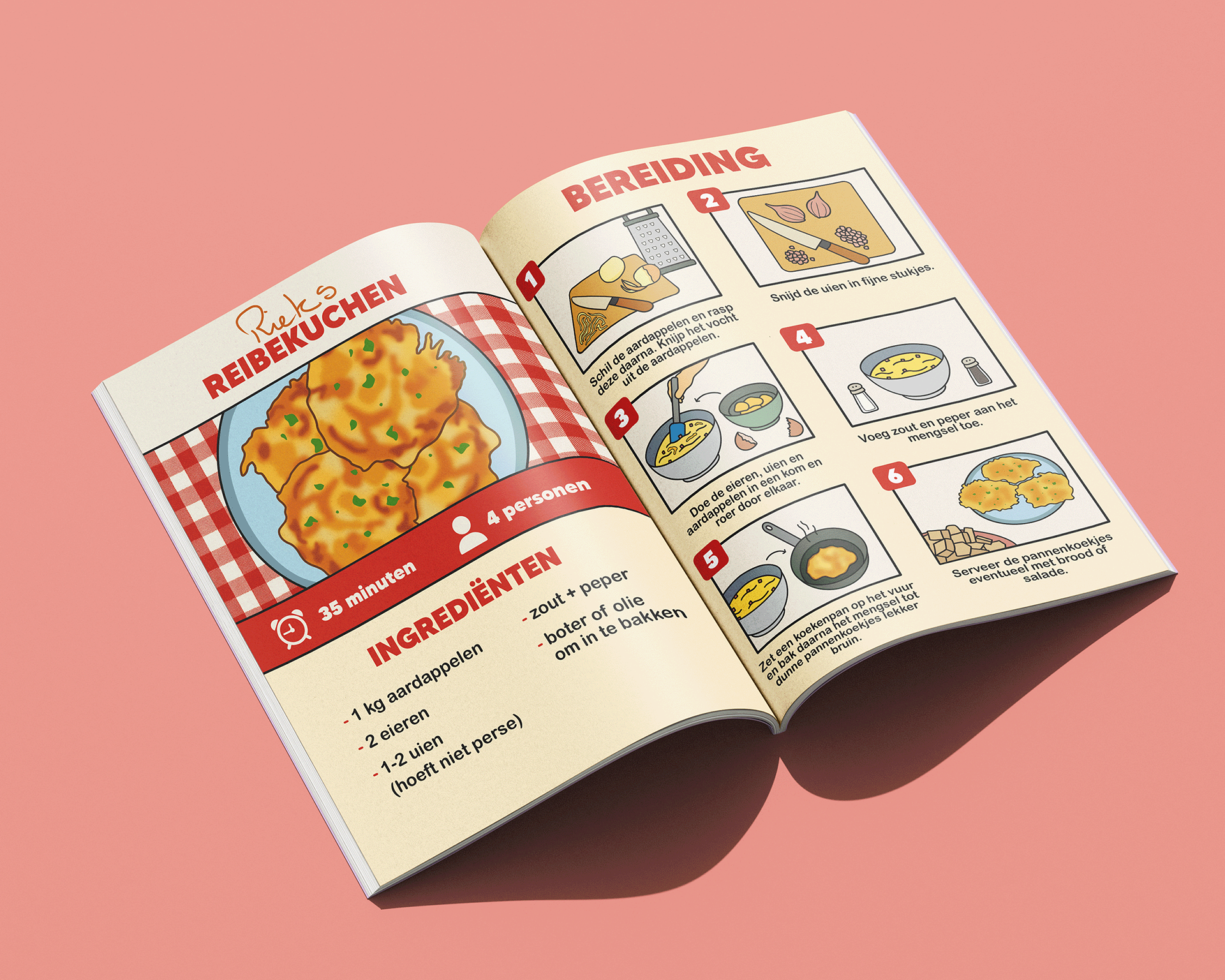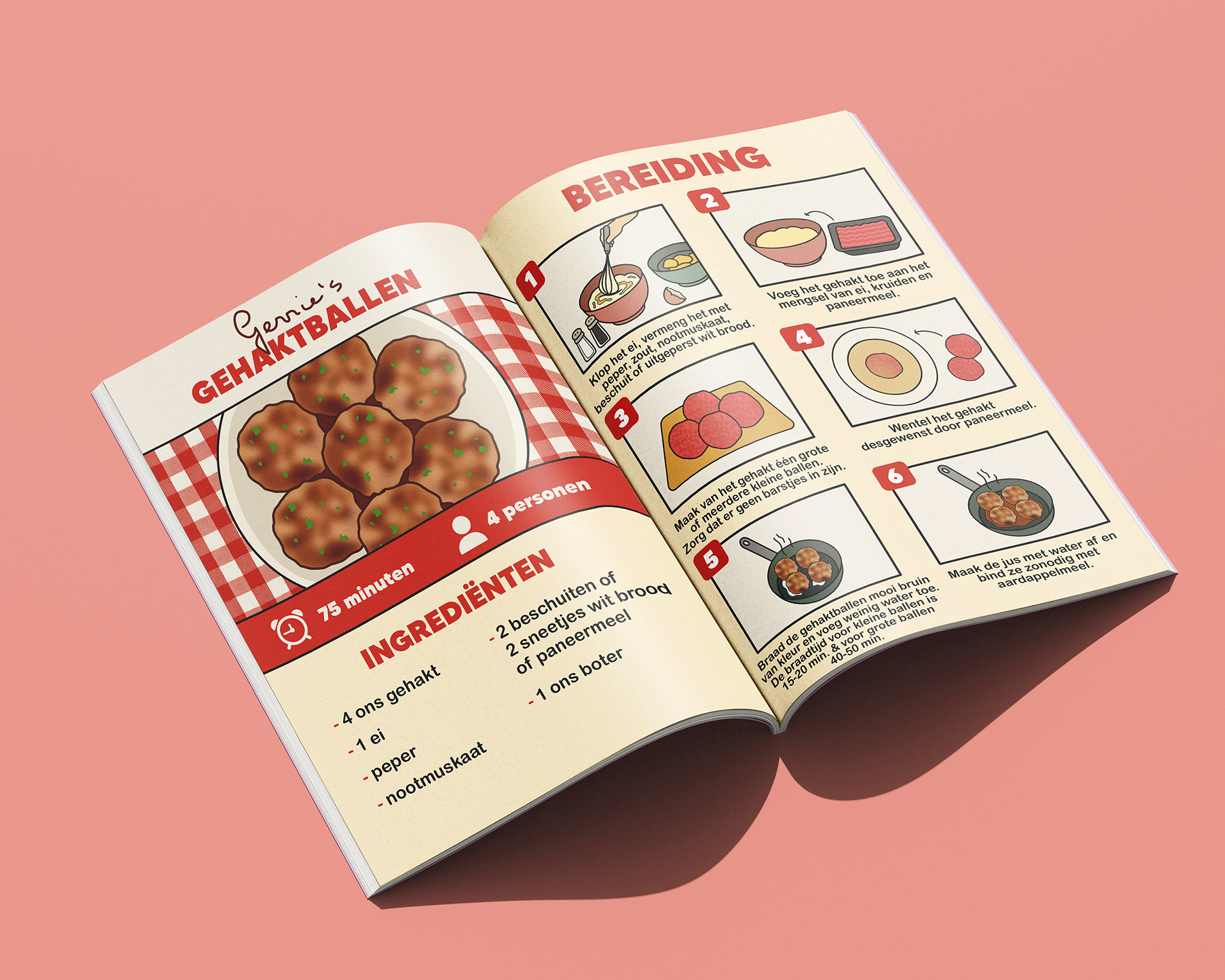 Passend bij de kookworkshops hebben we een kookboek samengesteld met familierecepten van verschillende mensen. Zij stuurden hun favoriete recepten in, die bij hen fijne herinneringen oproepen. Mijn taak was om deze recepten beeldend en zo duidelijk mogelijk uit te werken, zodat iedereen ze goed kan volgen. We kozen ervoor om de naam van de inzender bij ieder recept te plaatsen, zodat het concept persoonlijker wordt en mensen trots kunnen zijn op hun familierecept. Alle pagina’s heb ik uitgewerkt in dezelfde huisstijl.