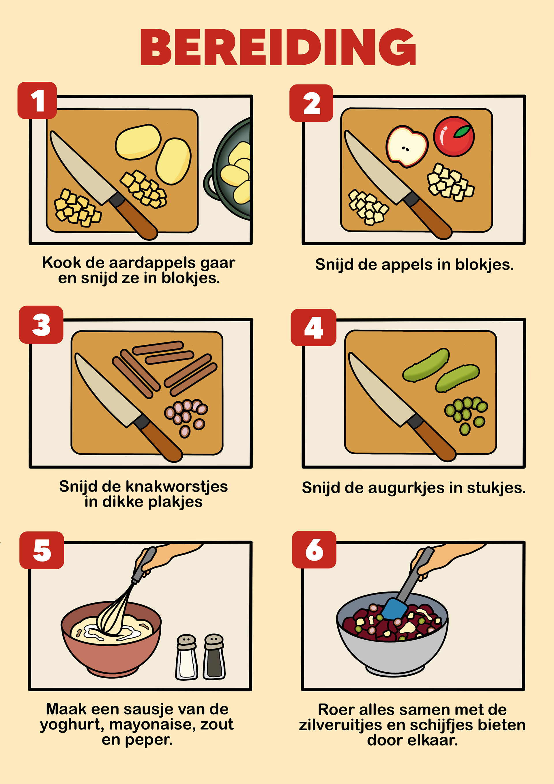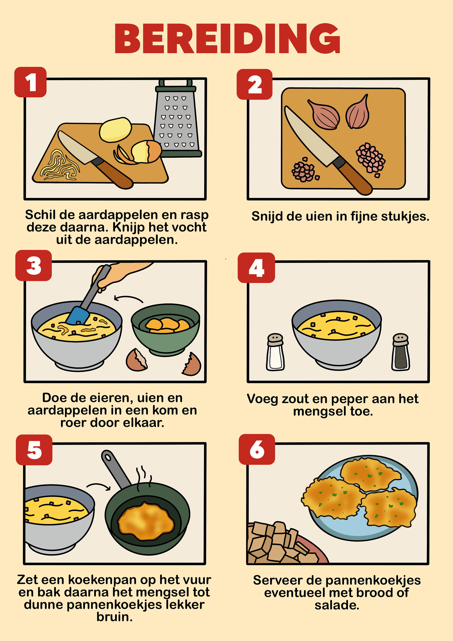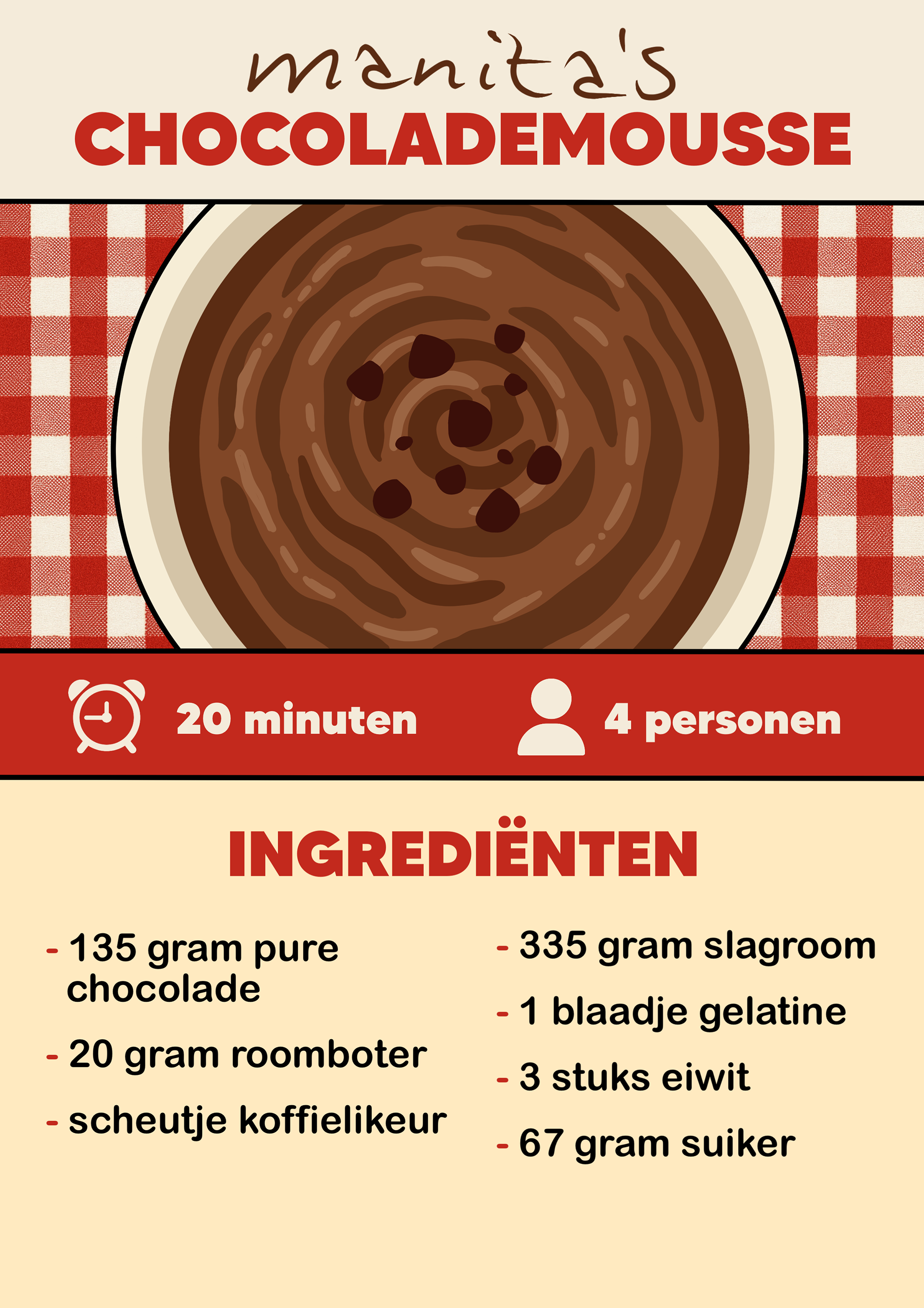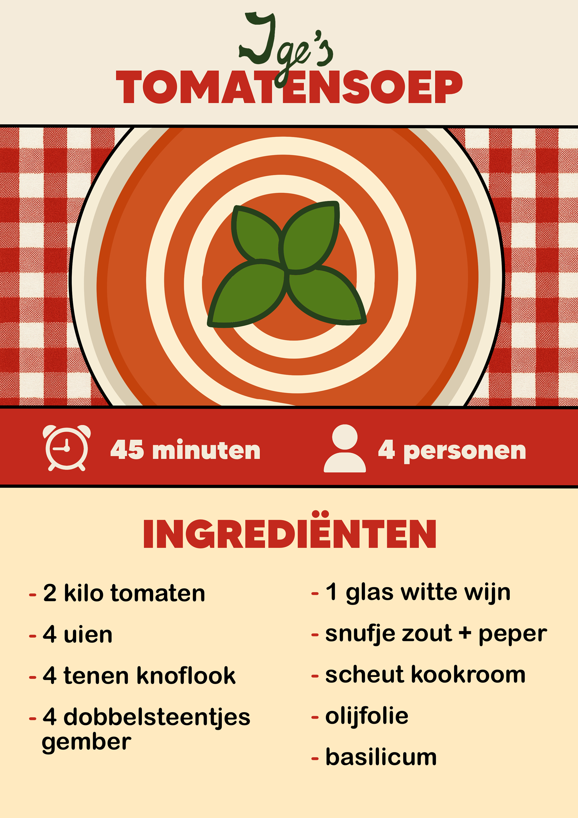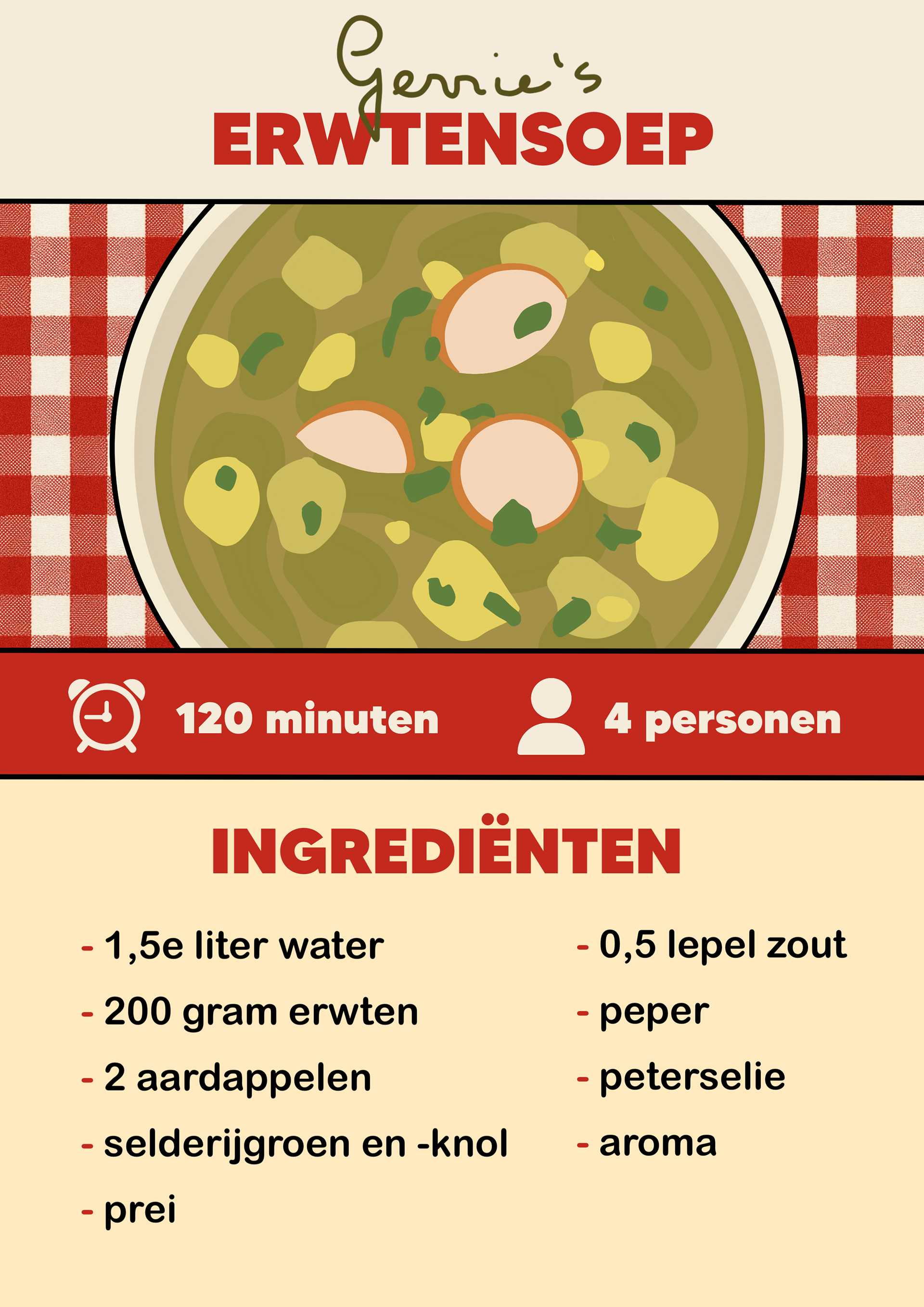 Passend bij de kookworkshops hebben we een kookboek samengesteld met familierecepten van verschillende mensen. Zij stuurden hun favoriete recepten in, die bij hen fijne herinneringen oproepen. Mijn taak was om deze recepten beeldend en zo duidelijk mogelijk uit te werken, zodat iedereen ze goed kan volgen. We kozen ervoor om de naam van de inzender bij ieder recept te plaatsen, zodat het concept persoonlijker wordt en mensen trots kunnen zijn op hun familierecept. Alle pagina’s heb ik uitgewerkt in dezelfde huisstijl.