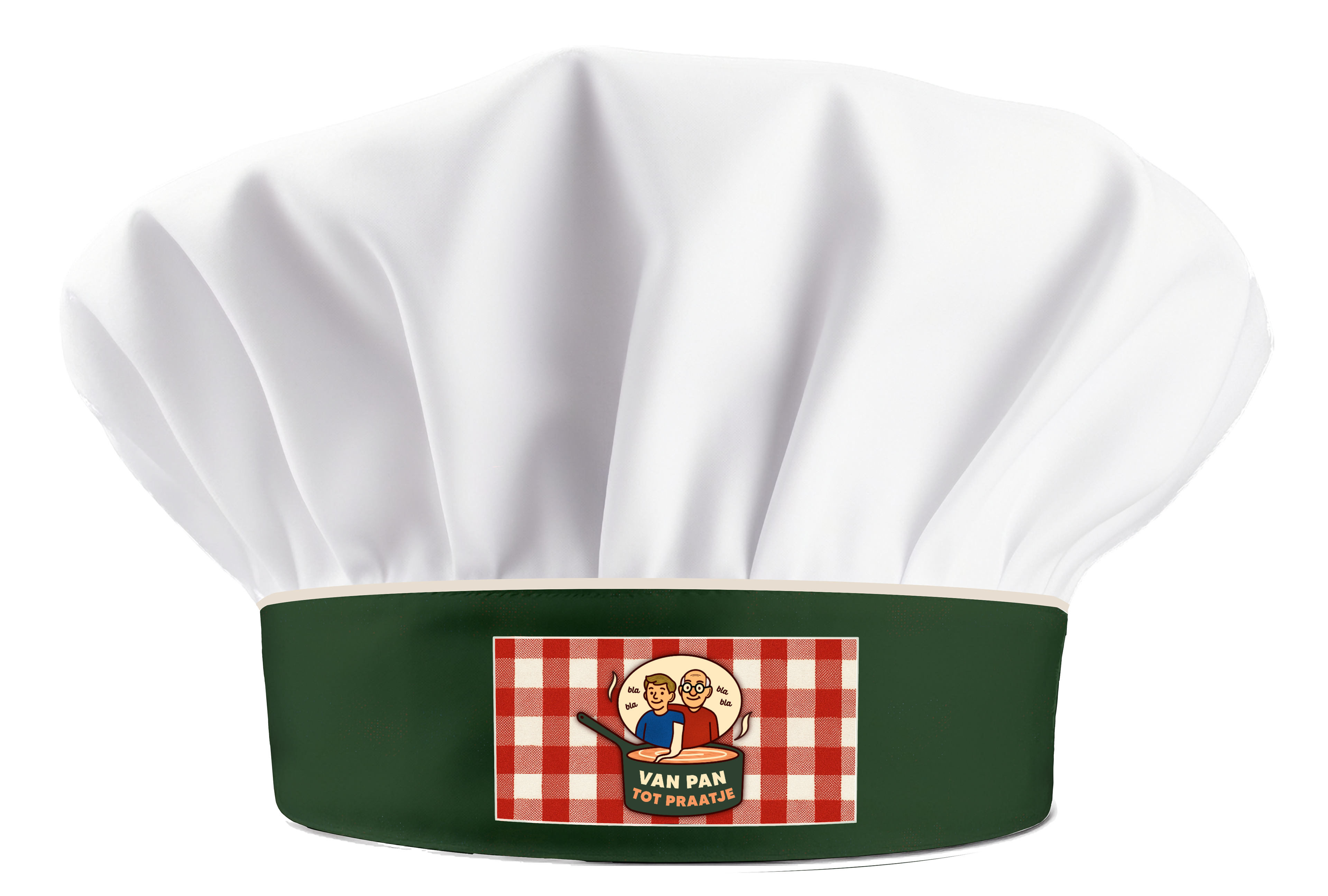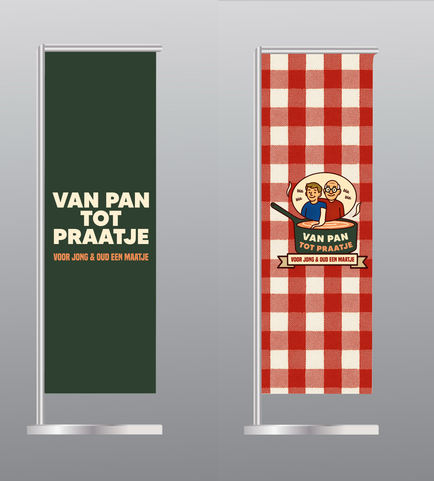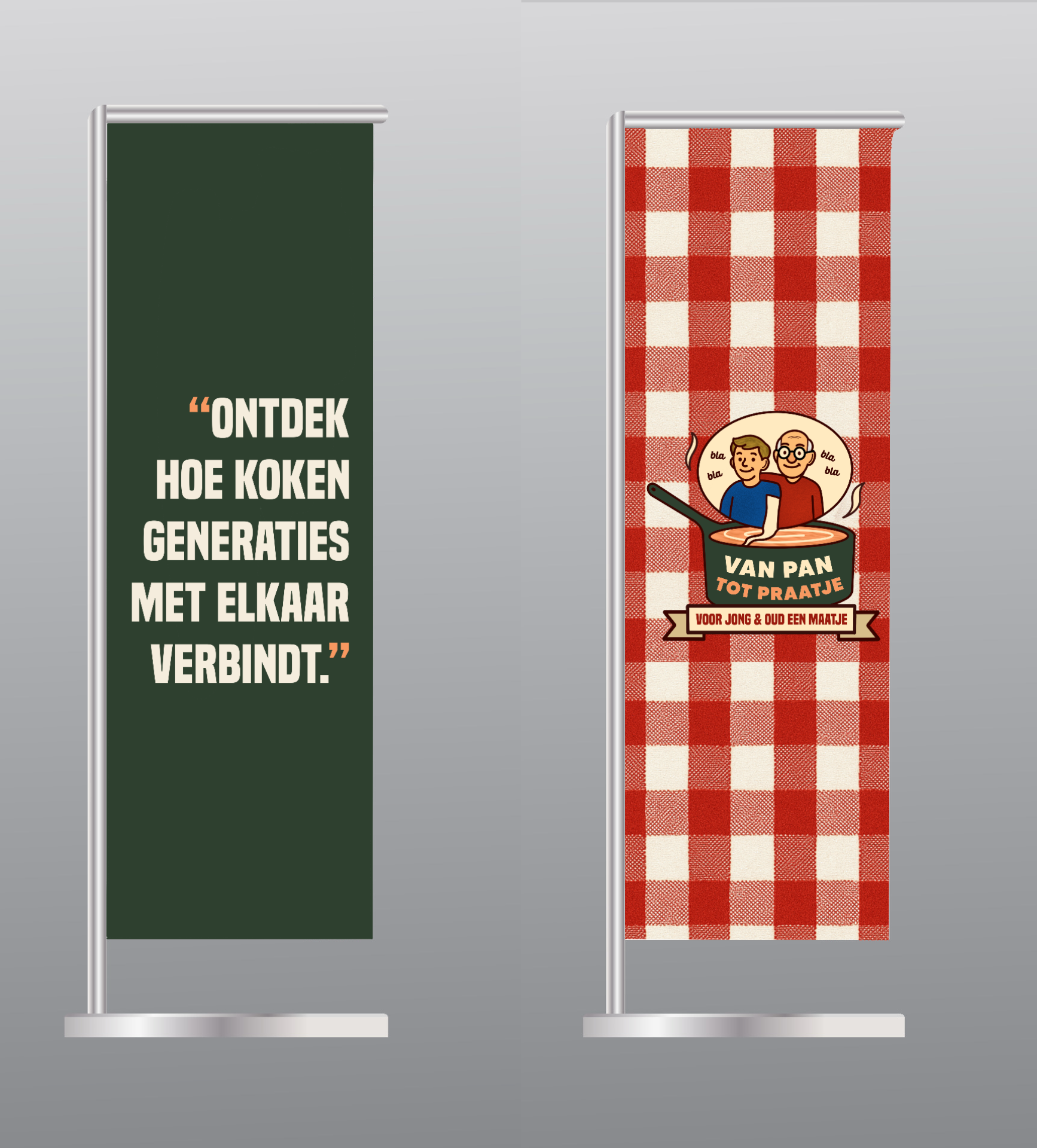 Dit zijn de ontwerpen van de poster en de vlaggen voor het concept 'Van Pan tot Praatje'. Hiermee kan aandacht getrokken worden voor het project. Daarnaast heb ik ook mockups gemaakt voor schorten, koksmutsen en servetten die gebruikt kunnen worden tijdens het koken.