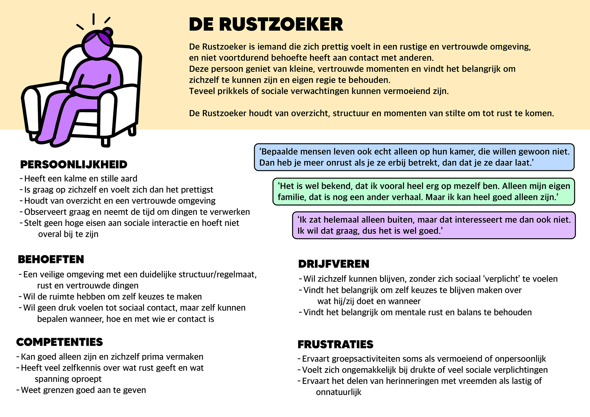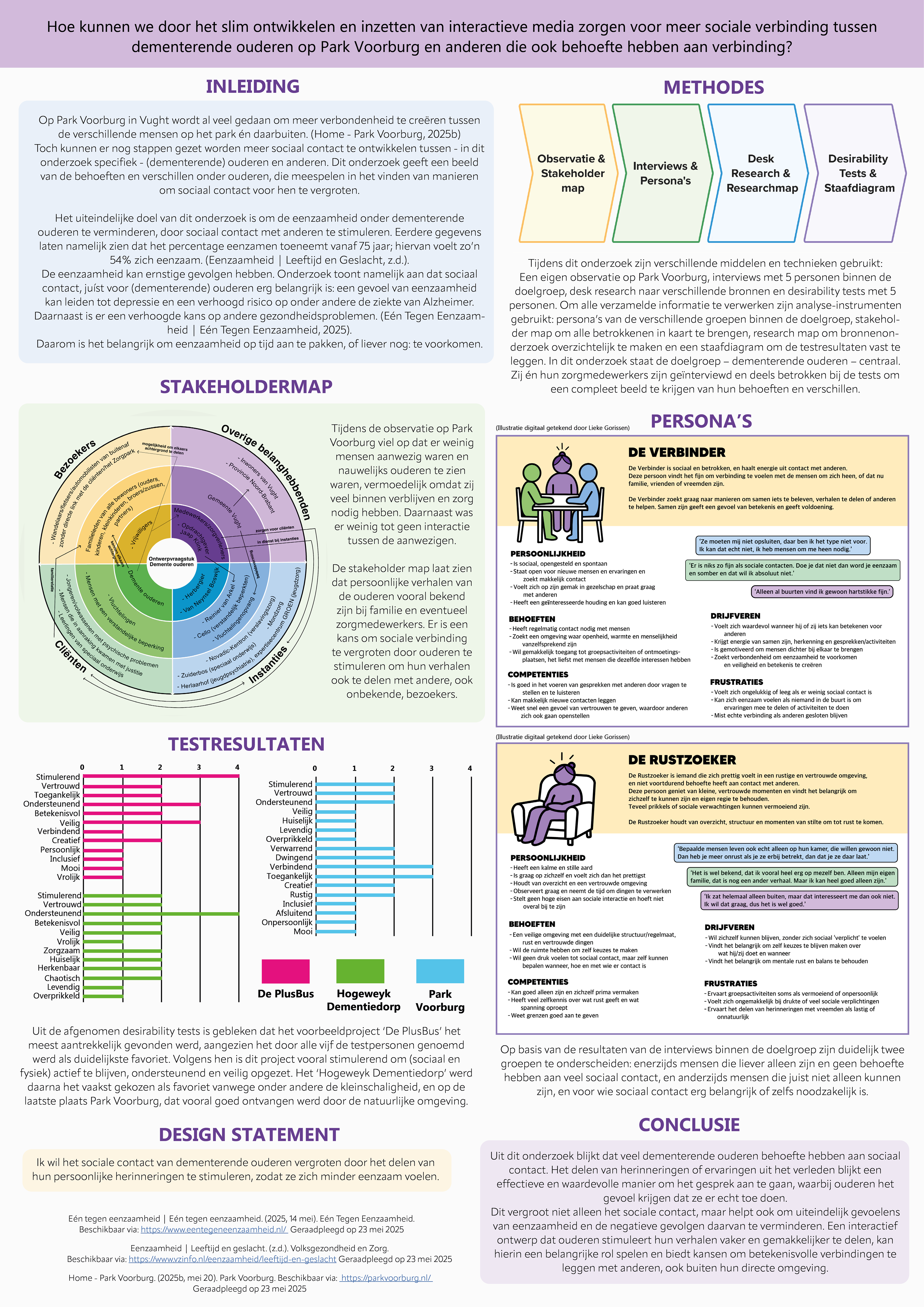 Hieronder laat ik ook mijn individuele onderzoek zien dat ik voorafgaand aan het groepsproject heb gedaan. Binnen Park Voorburg heb ik gekozen voor de doelgroep ouderen, specifiek ouderen met dementie. Mijn doel was om te onderzoeken hoe hun eenzaamheid verminderd kan worden, omdat ik uit eigen ervaring weet hoe vaak dat voorkomt. Dit onderzoek was voor mij heel bijzonder: ik heb verschillende ouderen gesproken, waaronder mijn oma’s, en zij vertelden mij mooie herinneringen van vroeger. Daaruit bleek dat ouderen veel waarde hechten aan sociaal contact, en dat het delen van herinneringen of ervaringen een fijne manier is om een gesprek op gang te brengen.
